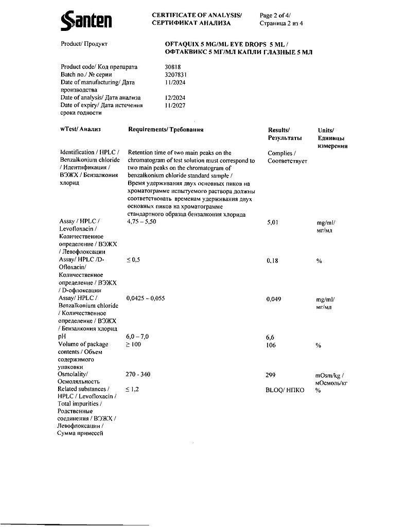 Средняя концентрация левофлоксацина при применении глазных капель Офтаквикс в водянистой влаге статистически значимо (р=0.0008) выше средней концентрации офлоксацина (1139.9 ± 717.1 нг/мл и 621.7 ± 368.7 нг/мл соответственно). Средняя концентрация левофлоксацина в плазме крови через 1 ч после применения - от 0.86 нг/мл до 2.05 нг/мл.