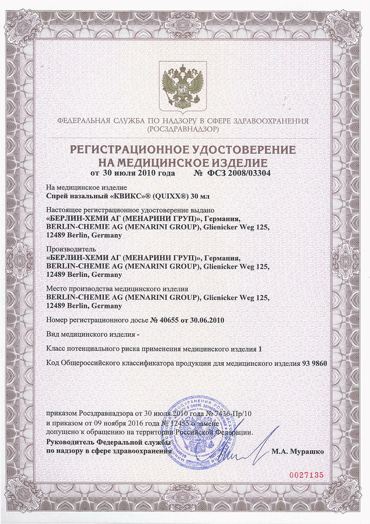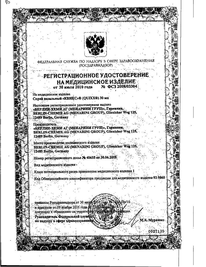Здоровый нос очищает вдыхаемый воздух от пыли, увлажняет и нагревает его до температуры тела, подготавливая к проникновению в легкие. Простуда, грипп и аллергии, сопровождаемые насморком, затрудняют выполнение данных функций. «Квикс®» снимает заложенность носа и помогает восстановить его нормальную работу, а также улучшает носовое дыхание.