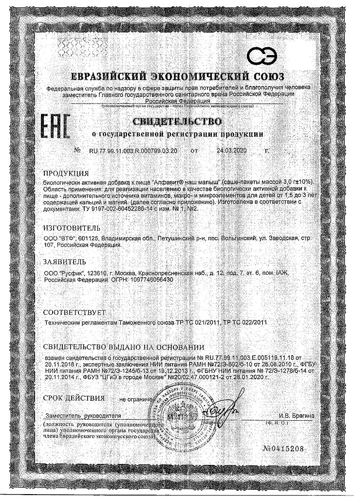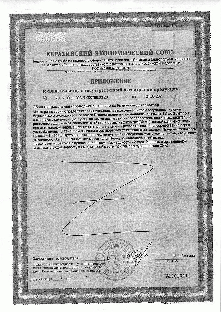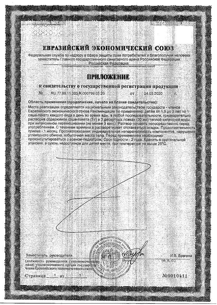 Детям от 1,5 до 3 лет по 1 саше-пакету каждого вида в день во время еды, в любой последовательности, предварительно растворив содержимое саше-пакета (3 г) в 3 десертных ложках (30 мл) теплой кипяченой воды при интенсивном перемешивании (не менее 3 мин.).