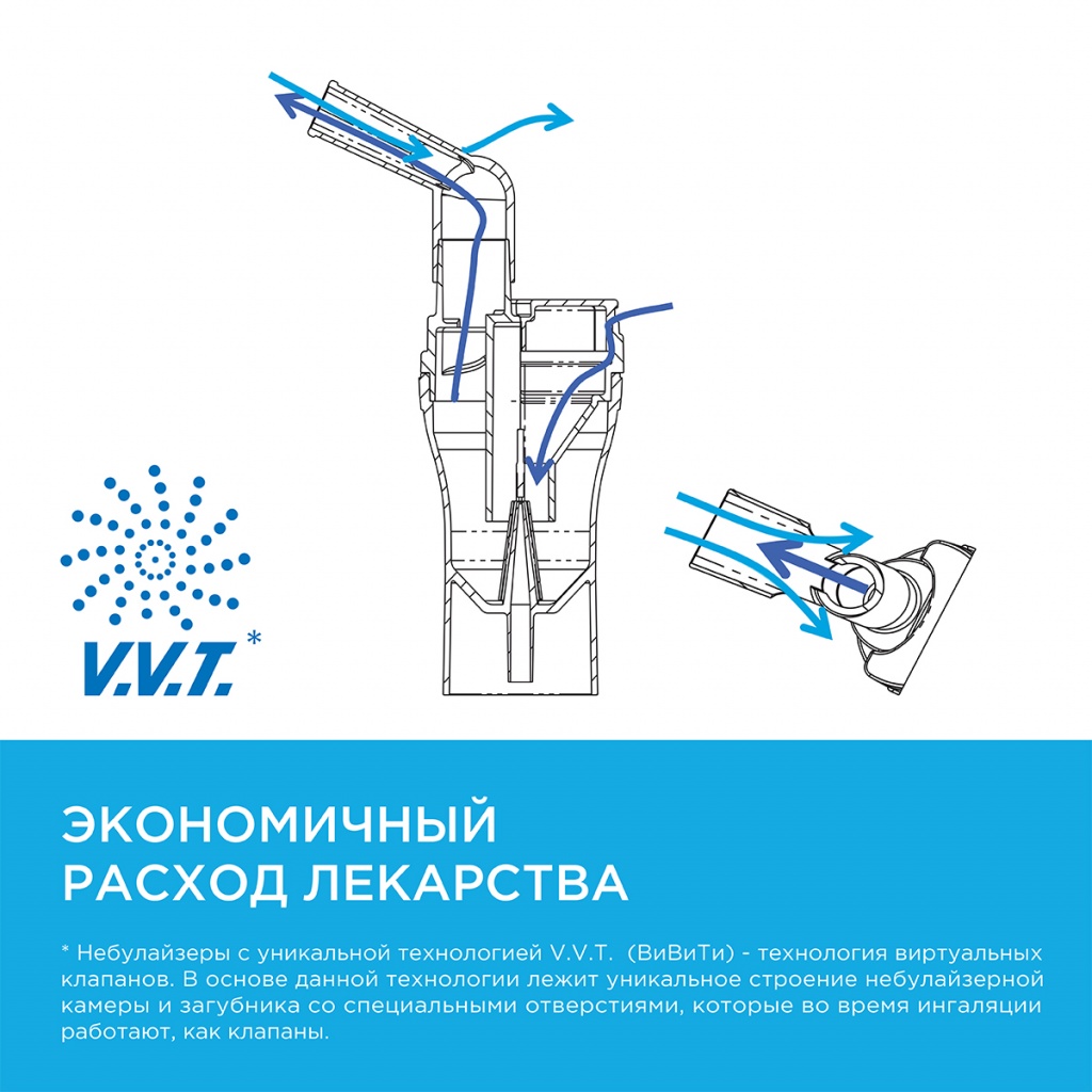 Компрессорный небулайзер OMRON CompAir (NE-C24-RU) основан на принципиально новой технологии так называемых виртуальных клапанов – Virtual Valve Technology (VVT). То есть клапанов как таковых в данной модели нет – они заменены специальными прорезями. Прорезь для вдоха находится на крышке резервуара, прорезь для выдоха – в загубнике. Таким образом, вдох и выдох оказываются разнесены, и если при вдохе все усилия направляются на то, чтобы втянуть в себя лекарство, то при выдохе емкость с препаратом вообще не затрагивается. Благодаря этому, компрессорный ингалятор OMRON CompAir (NE-C24-RU) позволяет тратить лекарство значительно эффективнее.