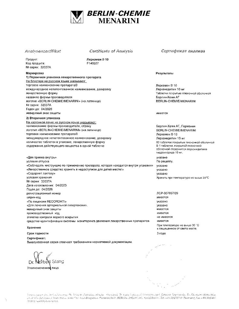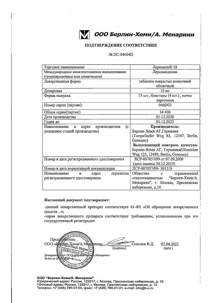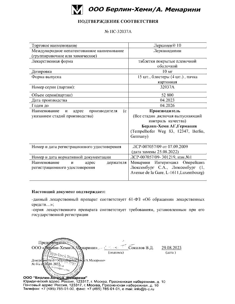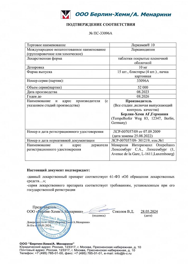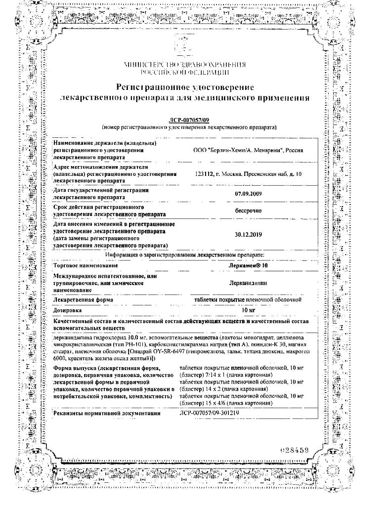 лерканидипина гидрохлорид 10 мг.