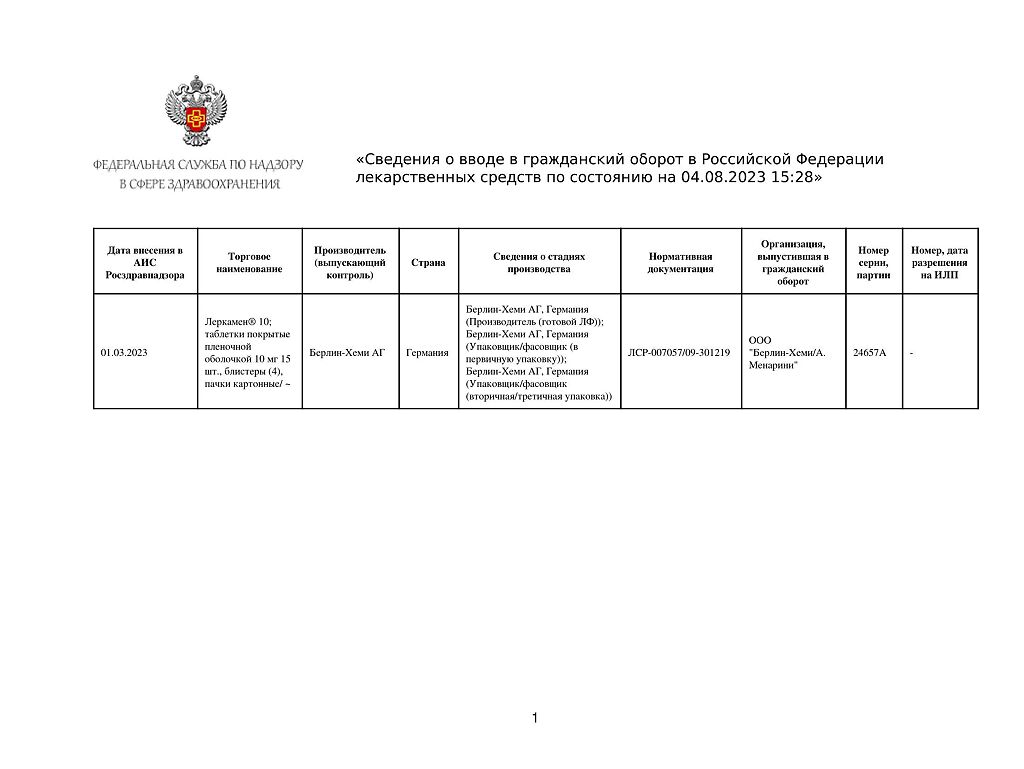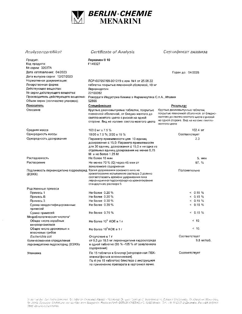 Лерканидипин полностью всасывается после приема внутрь. Cmax в плазме крови достигается через 1,5-3 часа и составляет 3,3±2,09 нг/мл и 7,66±5,90 нг/мл после приема 10 и 20 мг лерканидипина, соответственно.