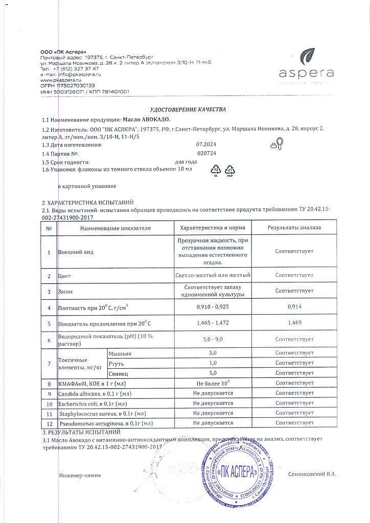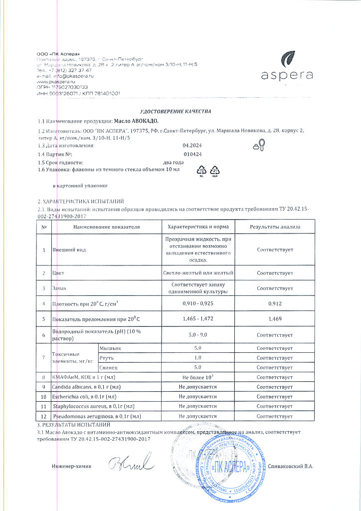 Документы Масло косметическое Авокадо 10 мл 1 шт