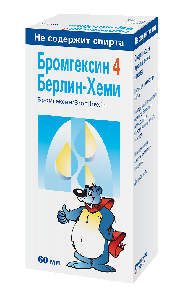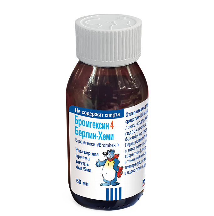 Поскольку у детей с 2-х лет даже после приема больших доз бромгексина ожидаются только легкие симптомы, при дозе бромгексина гидрохлорида до 80 мг (например, 100 мл препарата Бромгексин 4 Берлин-Хеми) детоксикацию можно не проводить. У детей более младшего возраста соответствующий предел дозы составляет 60 мг бромгексина гидрохлорида (6 мг/кг массы тела).