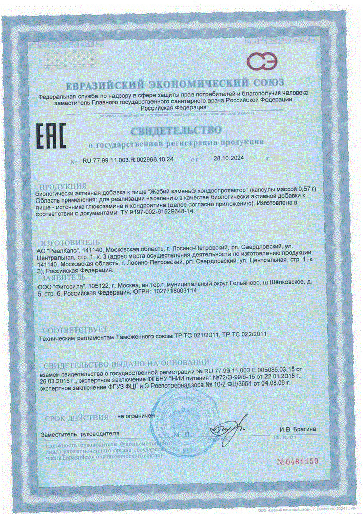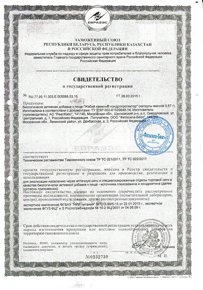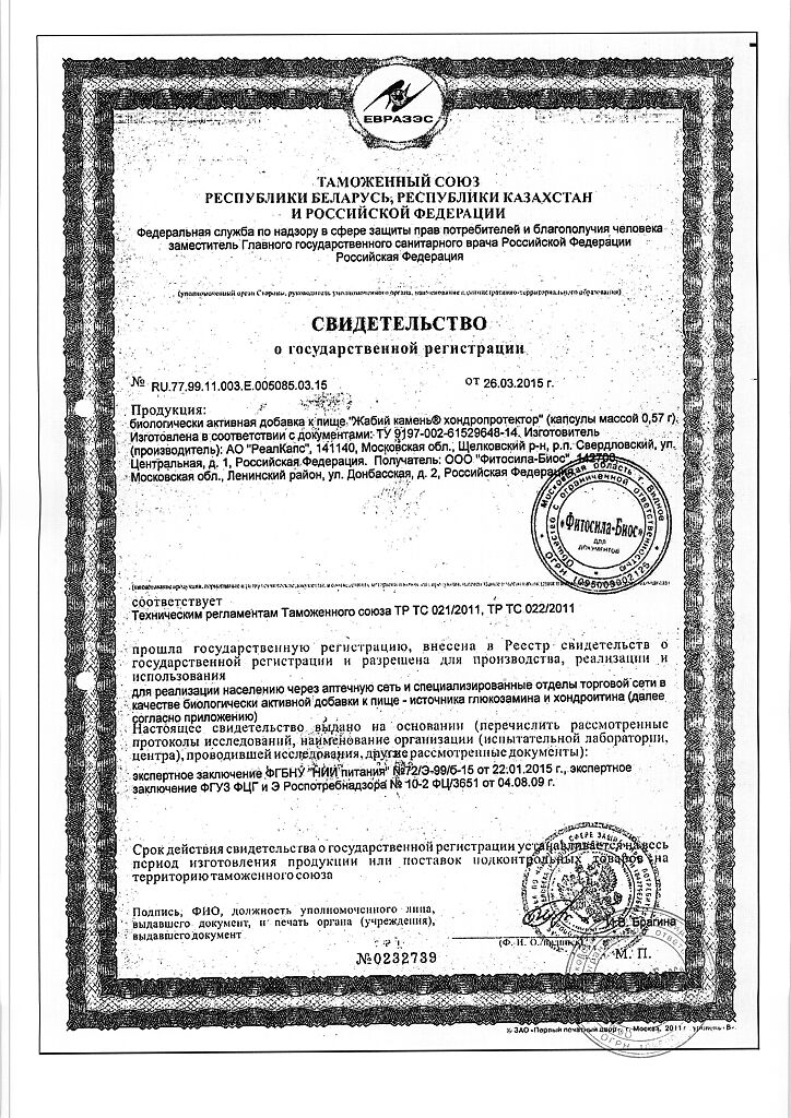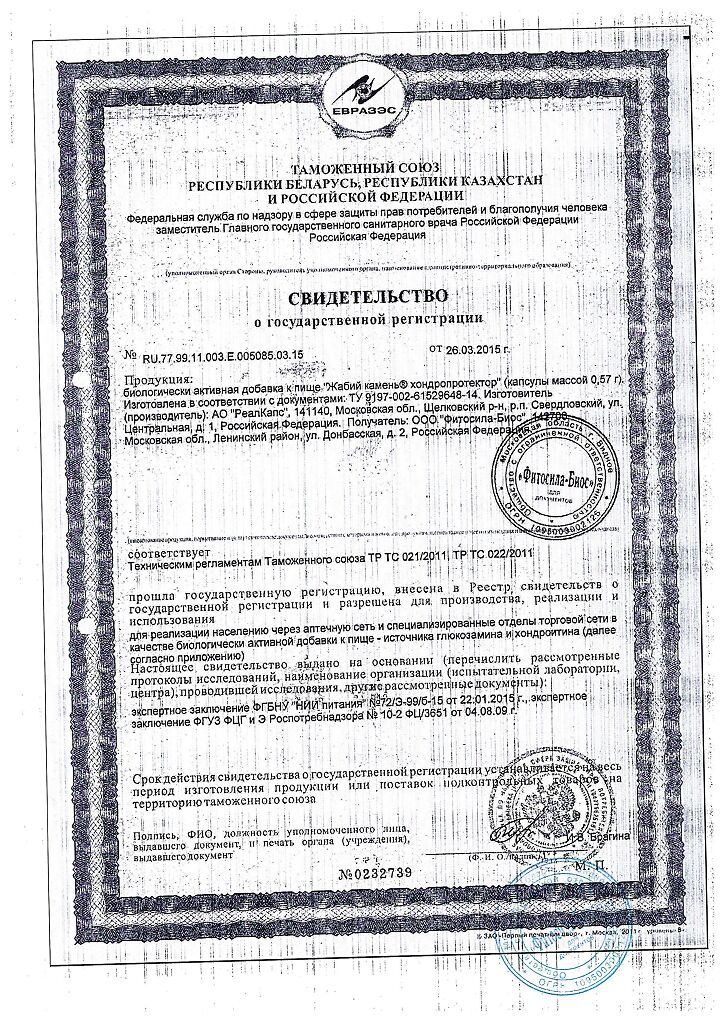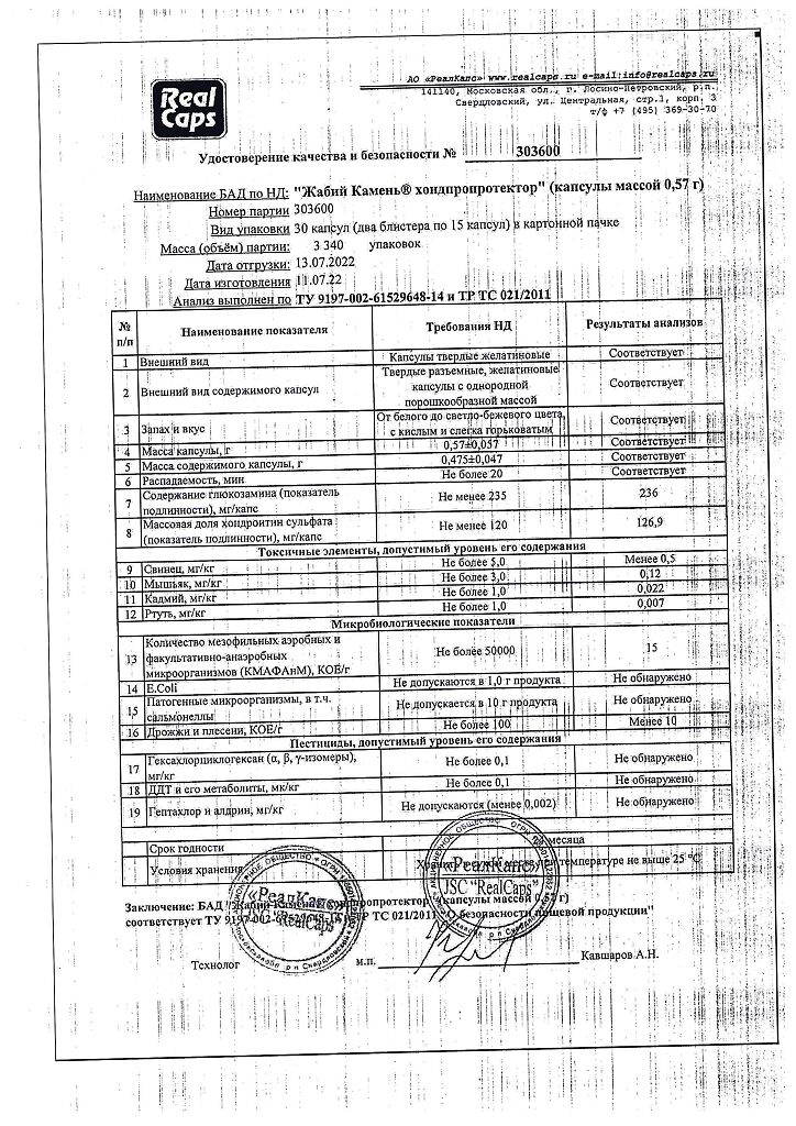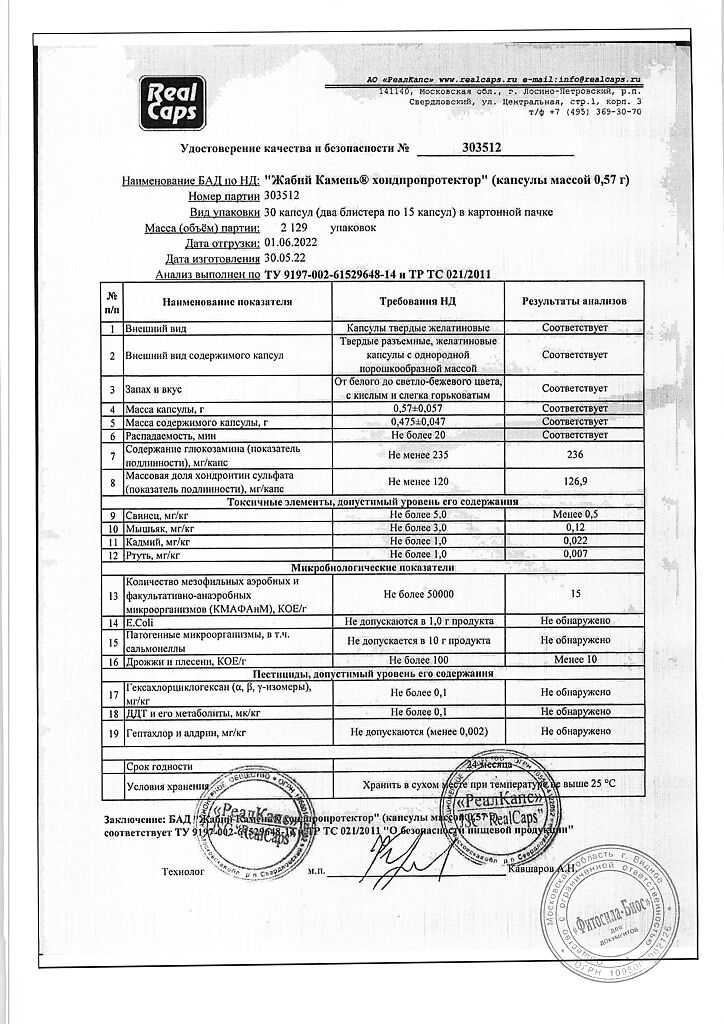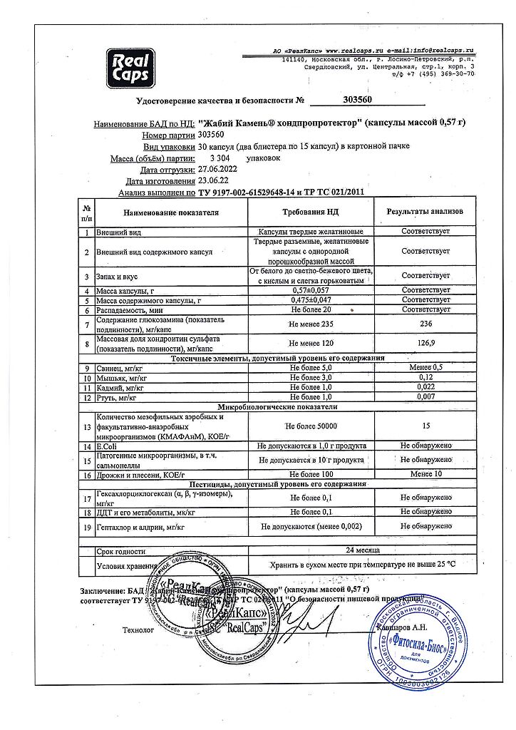 Биологически активные вещества, мг/кап., не менее: глюкозамин - 235,0, хондроитинсульфат - 120,0.
