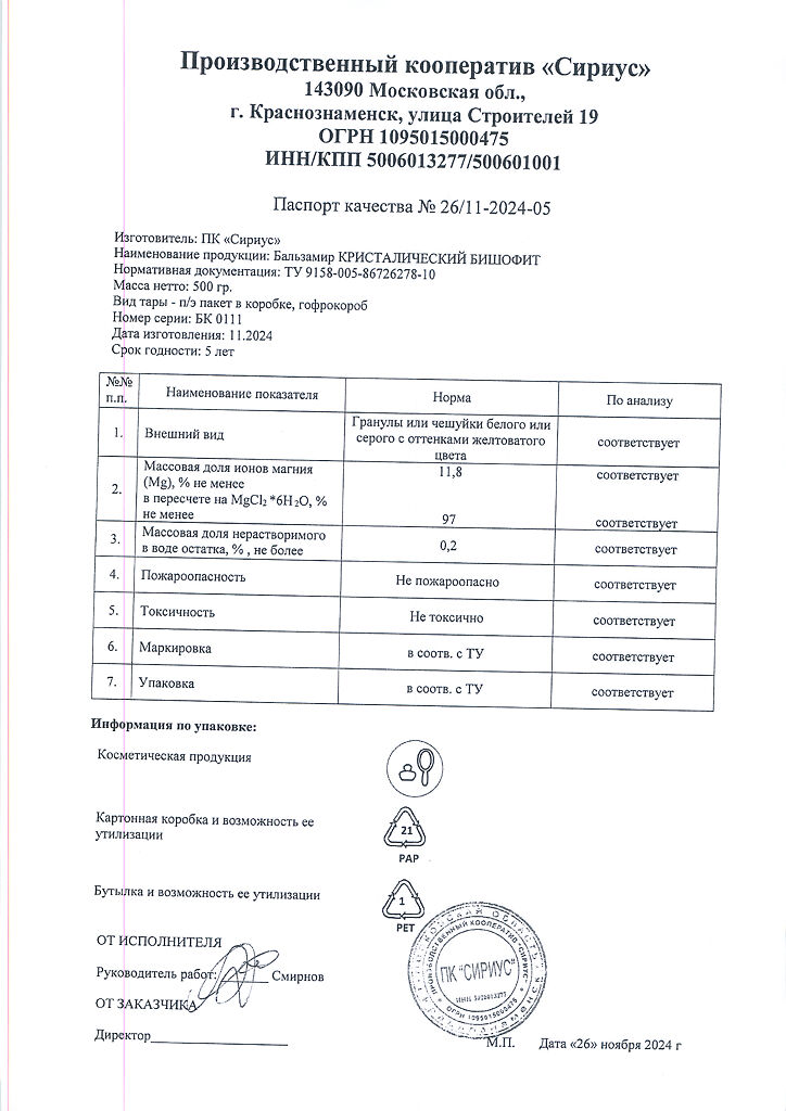 Документы Бальзамир Бишофит средство для ванн пакет 500 г 1 шт