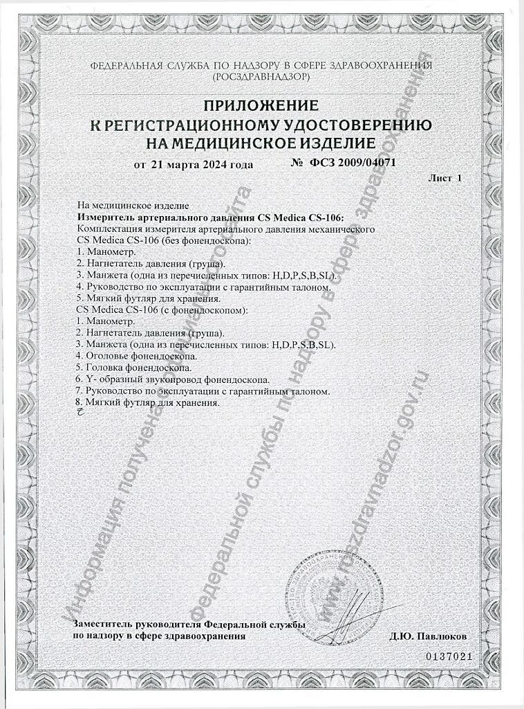 Прибор CS-106 снабжен манжетой, которая может устанавливаться на руке окружностью 24–42 см, способ установки — «нахлест». Груша прибора выполнена из мягкой, эластичной резины, которая позволяет производить нагнетание воздуха в пневмокамеру манжеты без особых усилий. Также в груше установлен воздушный клапан, снабженный сетчатым фильтром, который предохраняет механизм манометра и ниппеля воздушного клапана от попадания в них пыли и мелких частиц. Механизм воздушного клапана имеет игольчатый вентиль, позволяющий производить стравливание воздуха из манжеты с необходимой для измерения давления скоростью. Металлические трубки оголовья прибора снабжены мягкими, эластичными оливами, которые плотно прилегают к ушным отверстиям, не травмируя их. Измеритель артериального давления механический CS Medica CS-106 соответствует требованиям безопасности, предусмотренным для данного изделия медицинской техники в Российской Федерации.