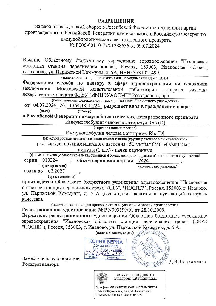 Cmax антител в крови достигается через 24 ч. Период полураспада иммуноглобулина человека антирезус Rh0(D) составляет 23-26 дней. T1/2 антител из организма - 4-5 нед.