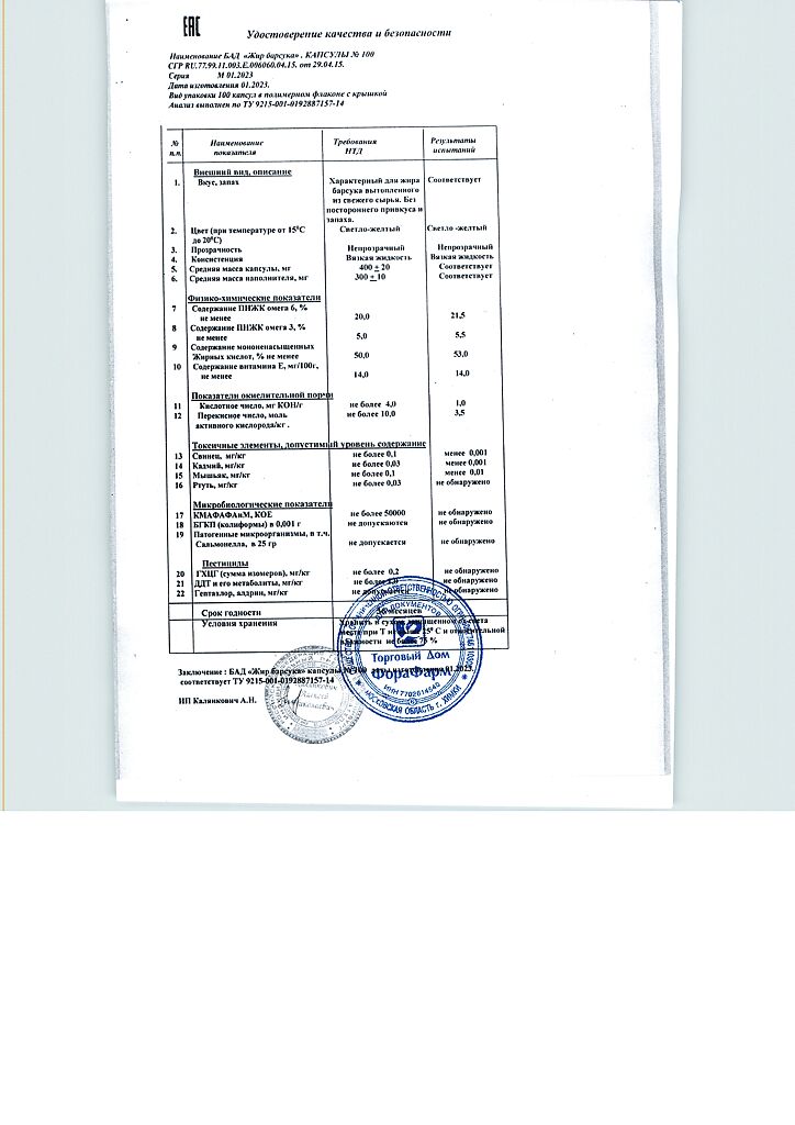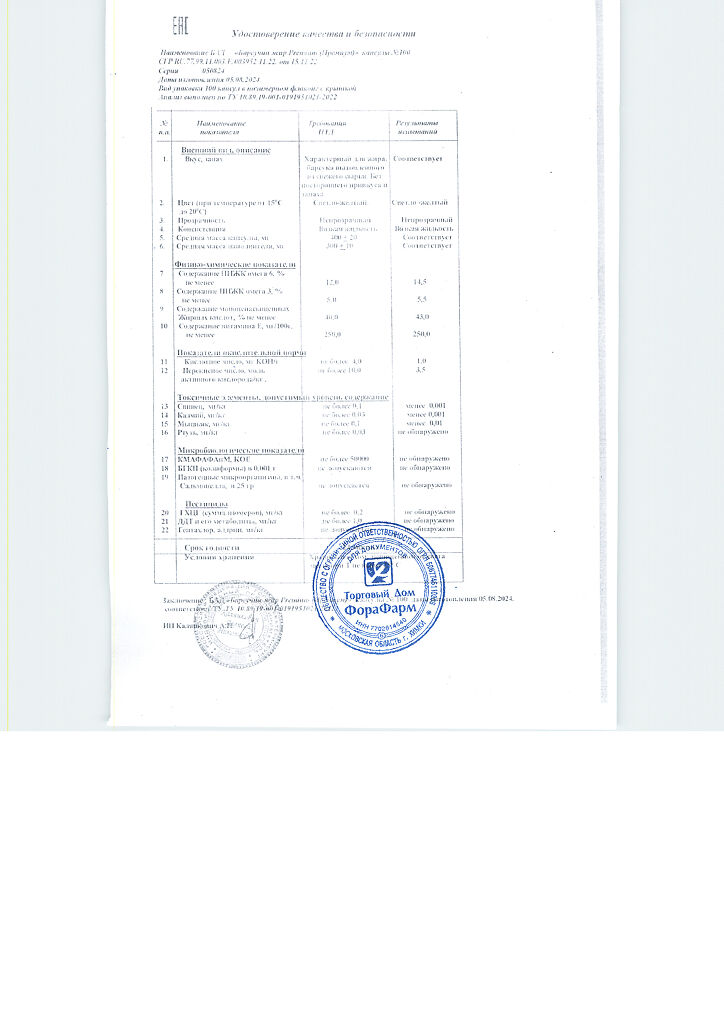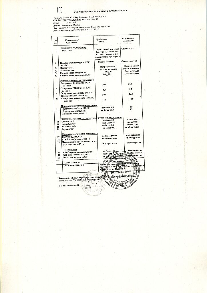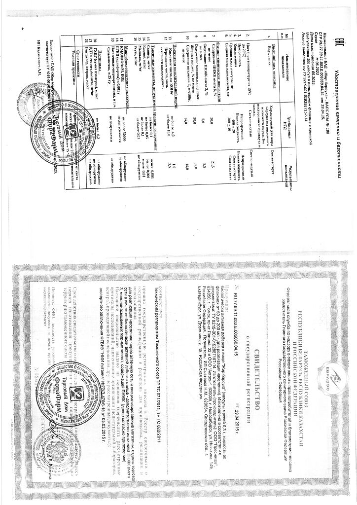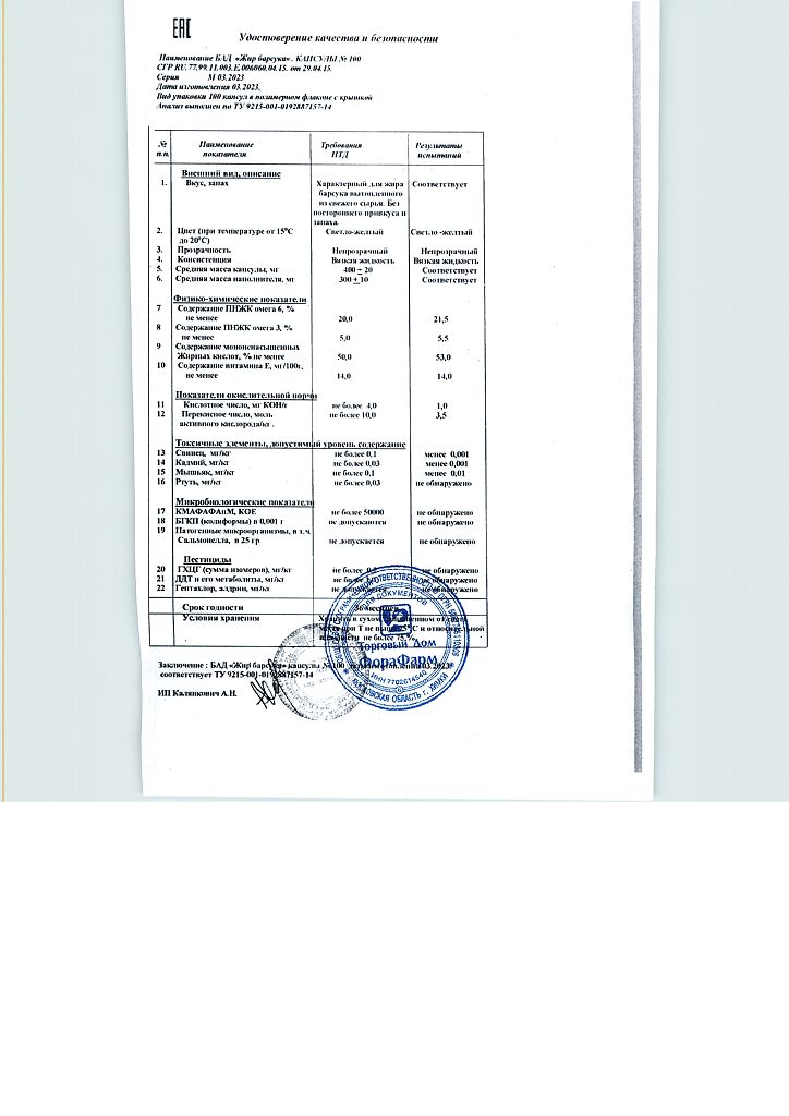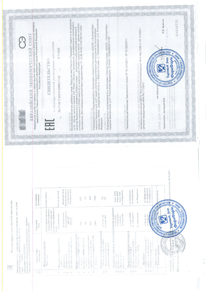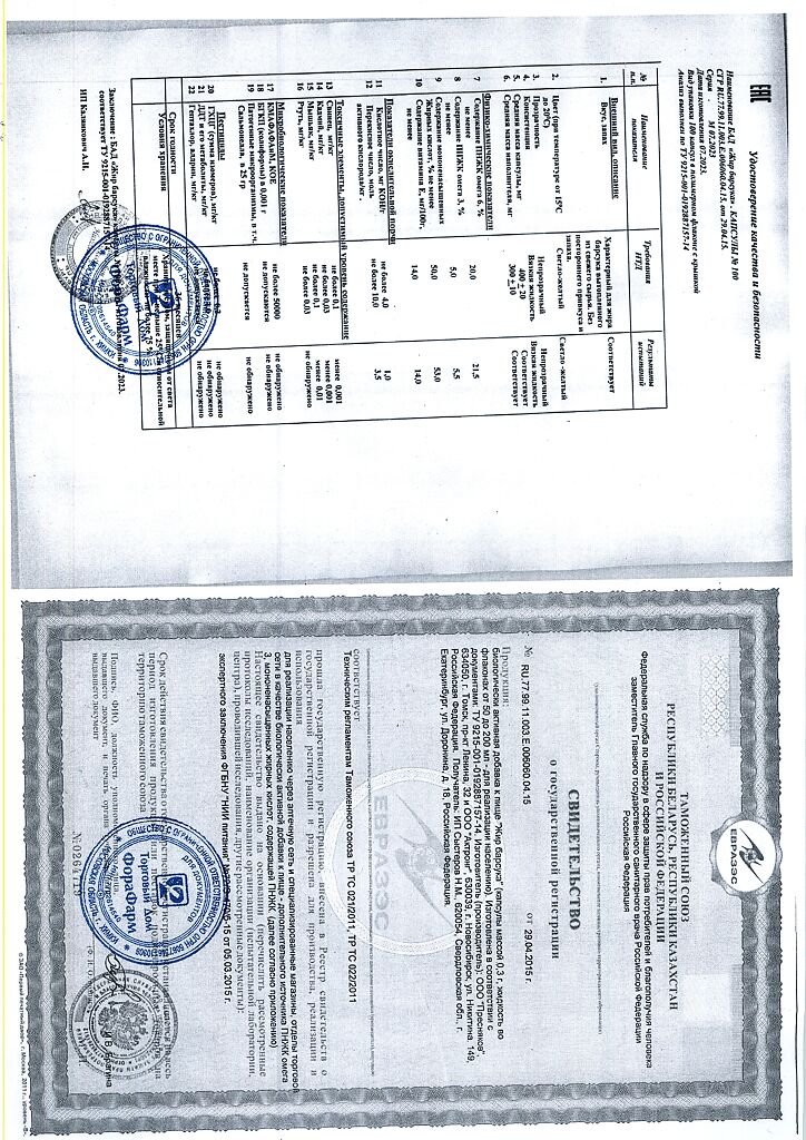 Пищевая ценность на 100 г продукта: белки - 0г, жиры - 100 г, углеводы - 0 г.Капсулы массой 400мг.