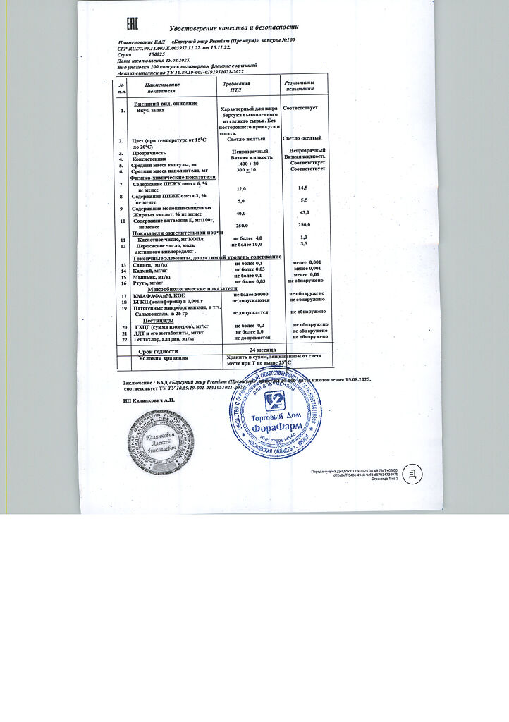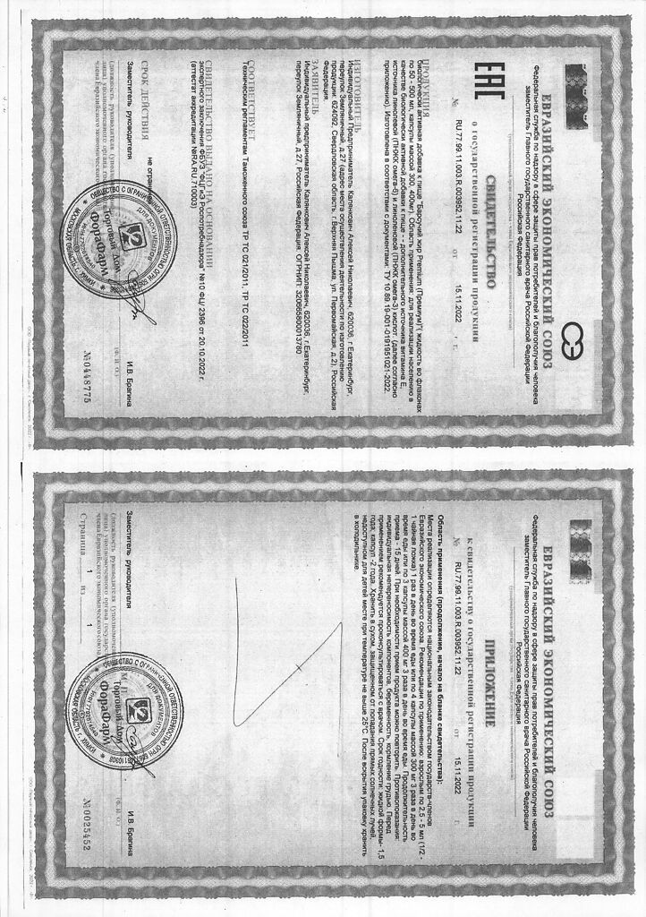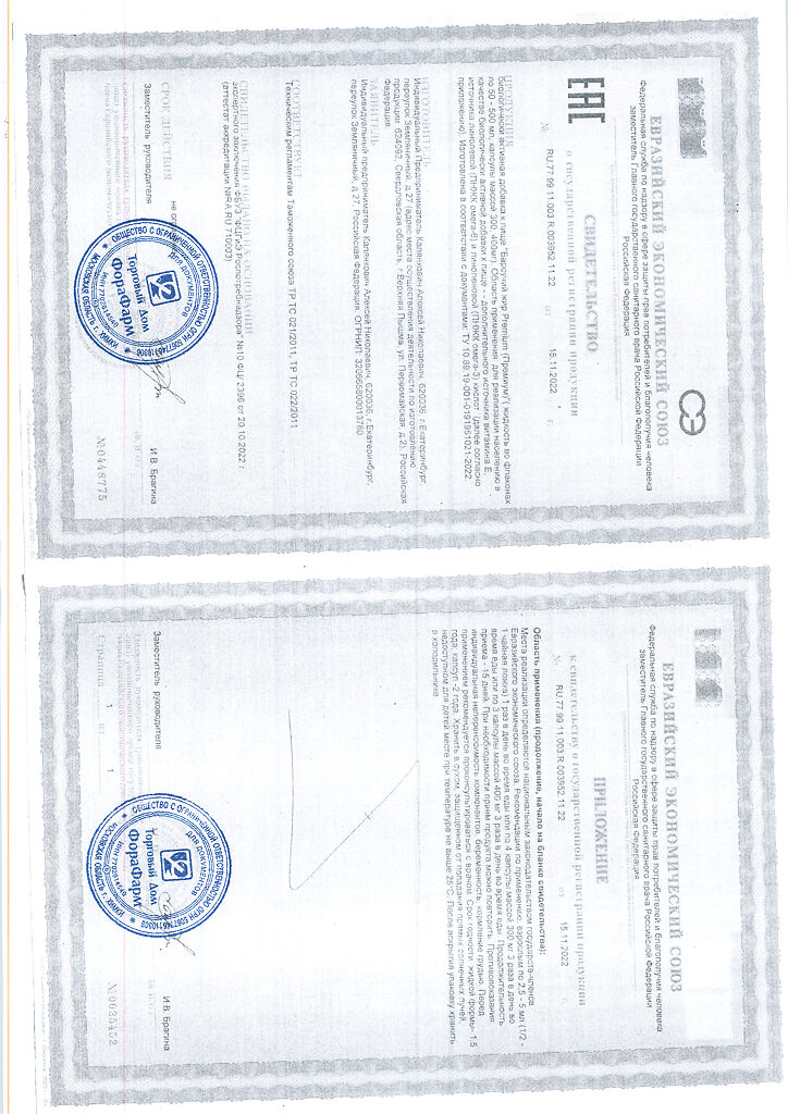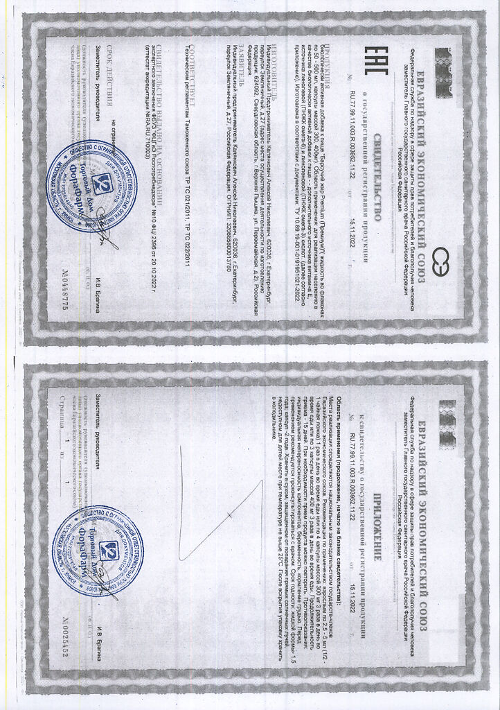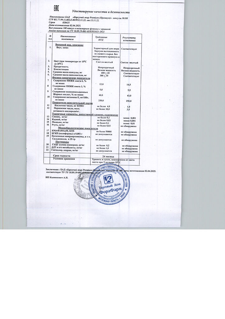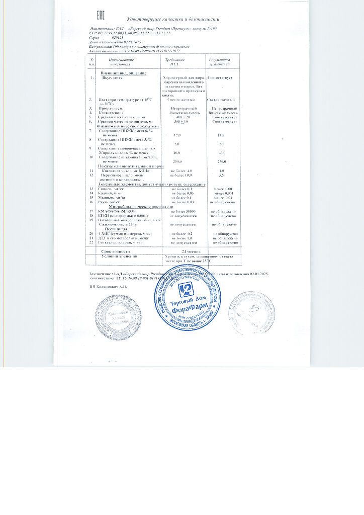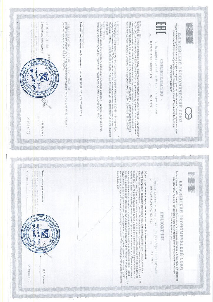 Пищевая ценность на 100 г продукта: белки - 0г, жиры - 100 г, углеводы - 0 г.Капсулы массой 400мг.