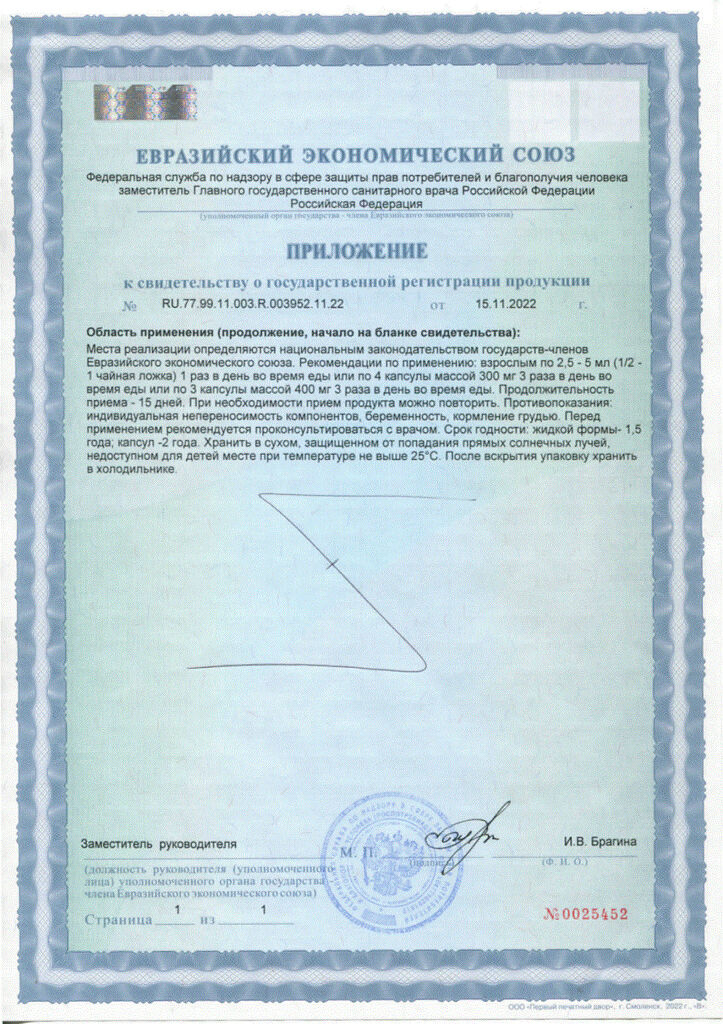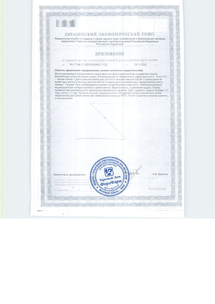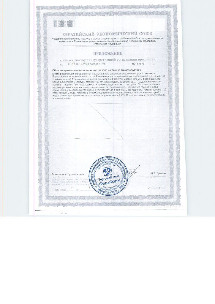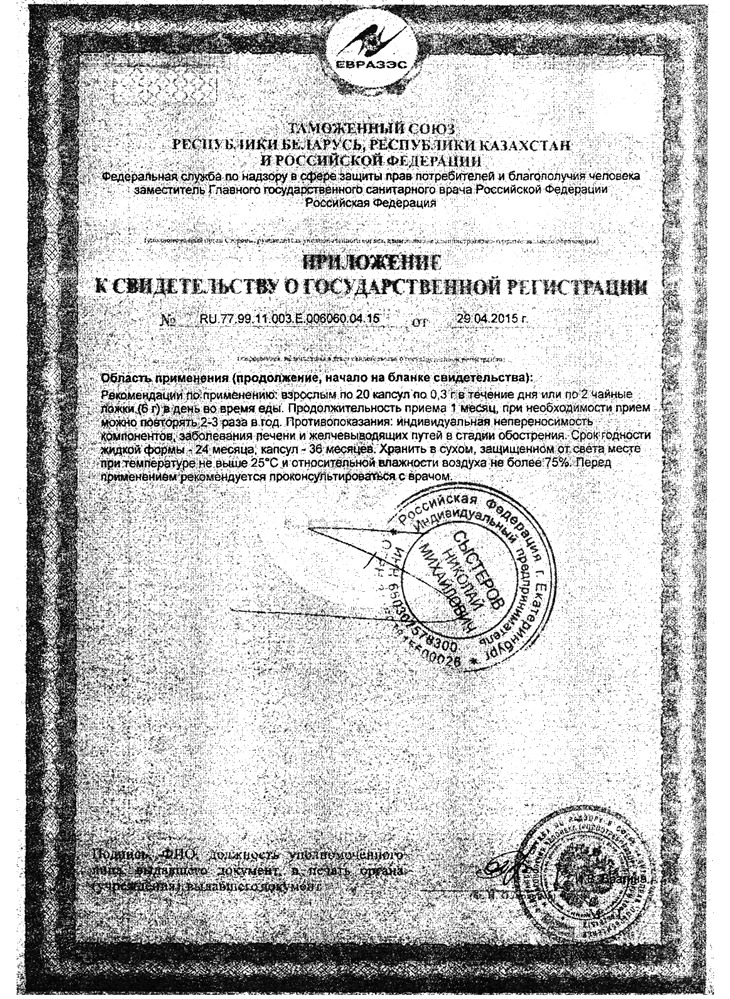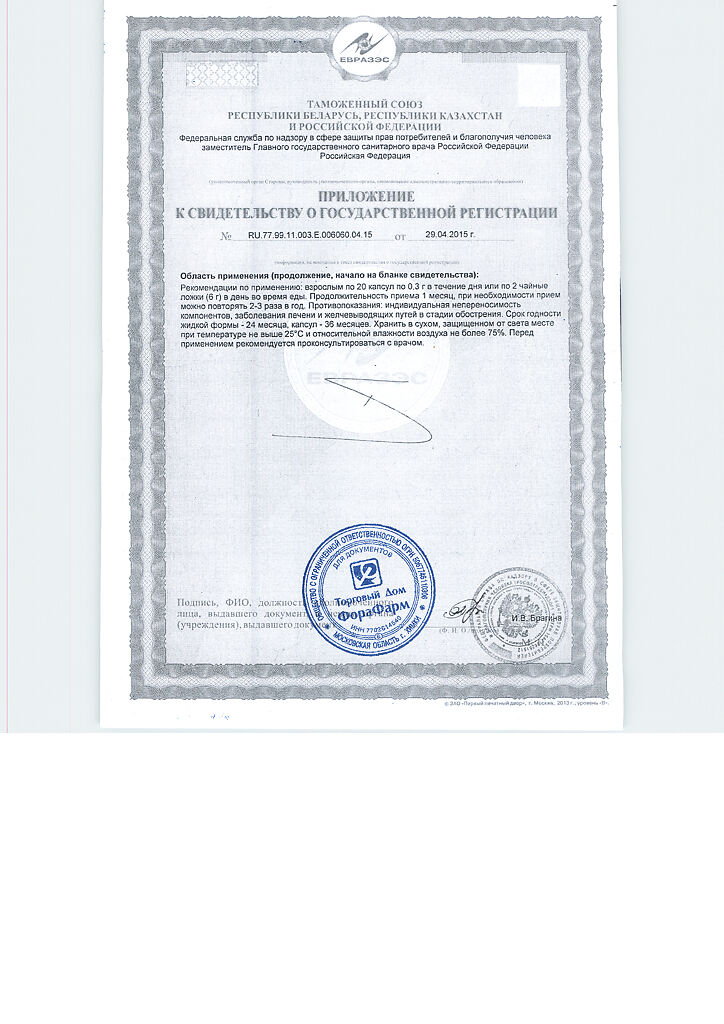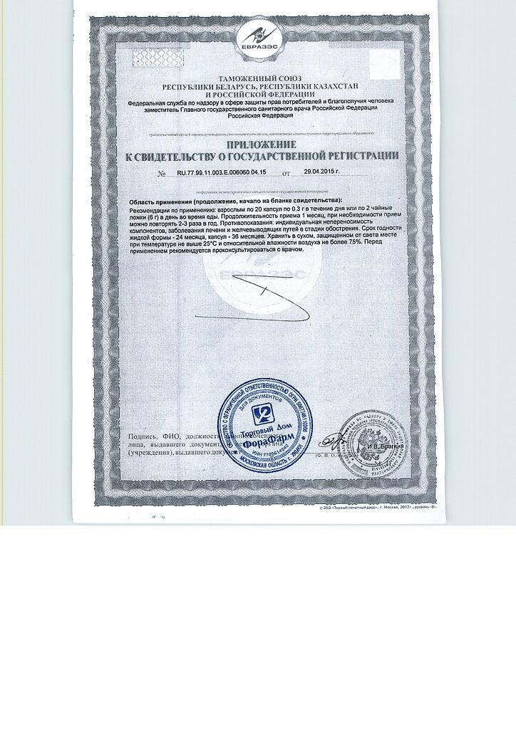 Взрослым по 3 капсулы массой 400 мг 3 раза в день во время еды. Продолжительность приема - 15 дней. При необходимости прием продукта можно повторить.