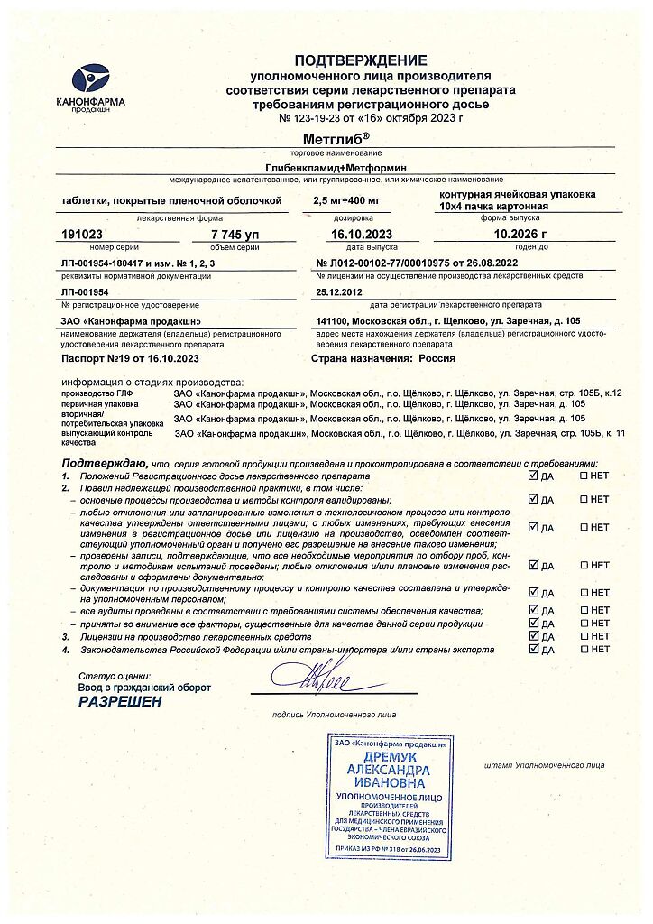 Этанол: очень редко наблюдается дисульфирамоподобная реакция (непереносимость этанола) при одновременном приеме этанола и глибенкламида. Этанол может увеличивать гипогликемическое действие (посредством ингибирования компенсаторных реакций или задержки его метаболической инактивации), что может способствовать развитию гипогликемической комы. В период лечения препаратом Метглиб® следует избегать приема спиртных напитков и лекарственных средств, содержащих этанол. Фенилбутазон повышает гипогликемический эффект производных сульфонилмочевины, (замещая производные сульфонилмочевины в местах связывания с белком и/или уменьшая их выведение). Предпочтительно применять другие противовоспалительные средства, обнаруживающие меньшие взаимодействия, или же предупреждать пациента о необходимости самостоятельного контроля уровня гликемии; при необходимости, следует скорректировать дозу при совместном применении противовоспалительного средства и после его прекращения.