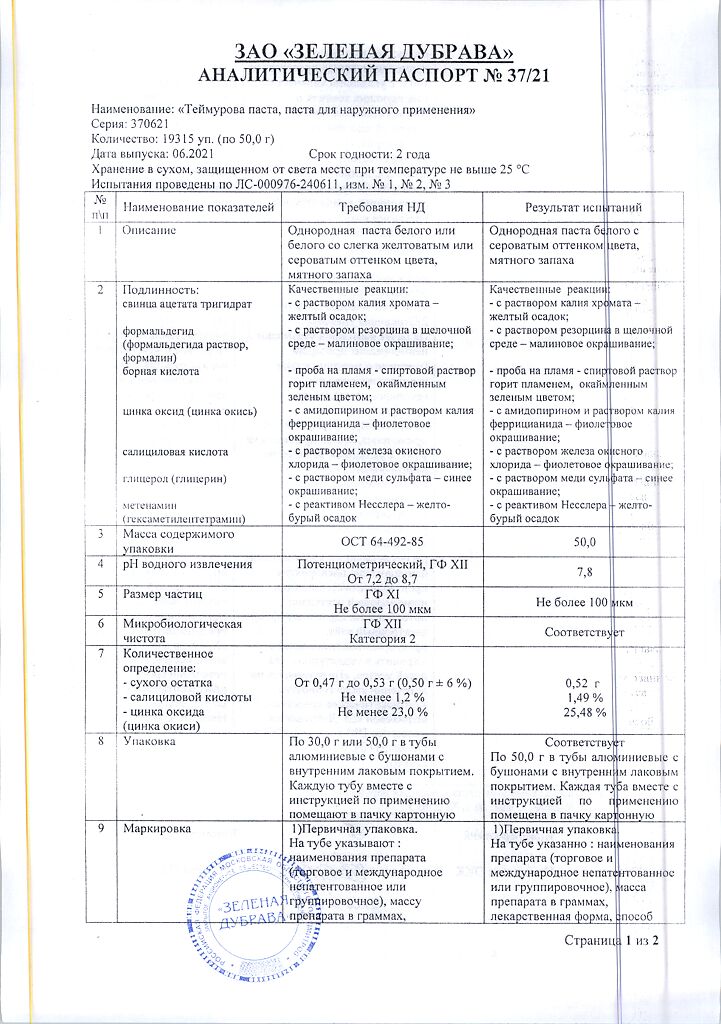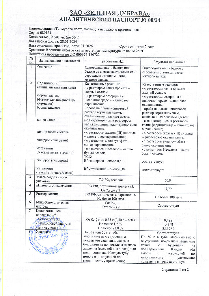 Действующее вещество: Борная кислота, Метенамин, Тальк, Натрия тетраборат, Салициловая кислота, Свинца ацетат, Формальдегид, Цинк