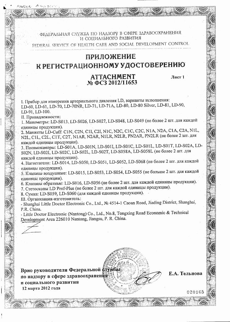Тонометр комбинированного типа LD-81 произведен в Китае компанией Little Doctor. Прибор предназначается для использования в домашних условиях с целью наблюдения за уровнем артериального давления. Тонометр LD-81 работает по принципу Короткова. Для определения диастолического и систолического артериального давления прослушиваются тона и снимаются данные манометра. Комплект состоит из манжеты, стетоскопа, манометра, нагнетателя, руководства для пользователей, упакованных в сумочку из винилового материала.