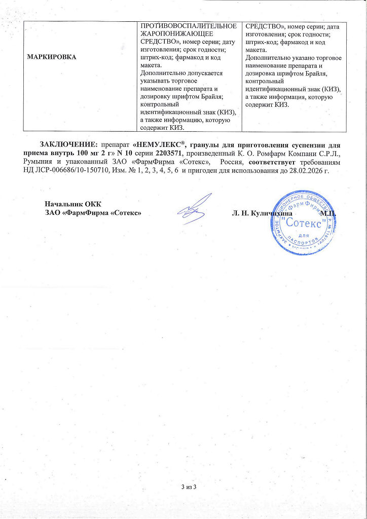 Документы Немулекс гранулы д/приг суспензии для приема внутрь 100 мг 2 г 10 шт