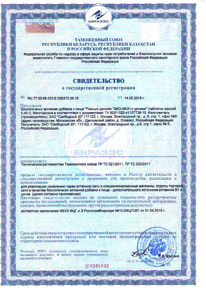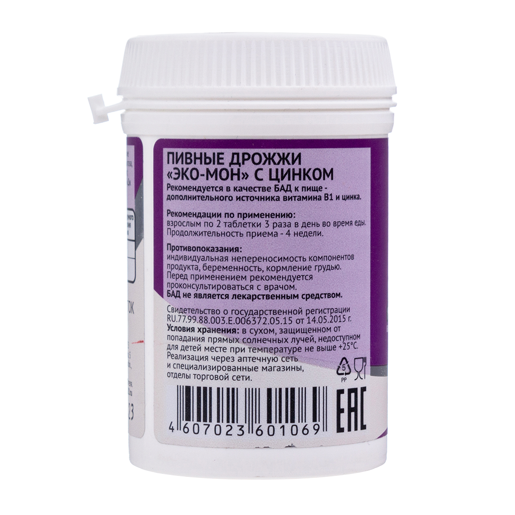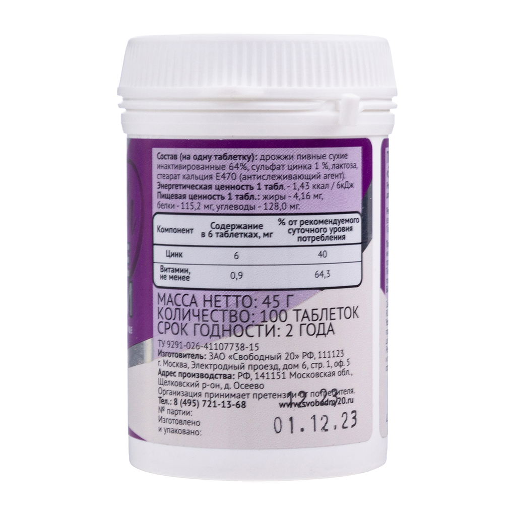 Биологически активные вещества: содержание витамина В1, мг/таб., не менее - 0,15, цинк - 1,0±0,35.