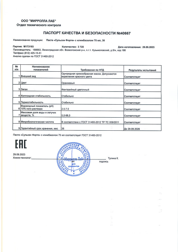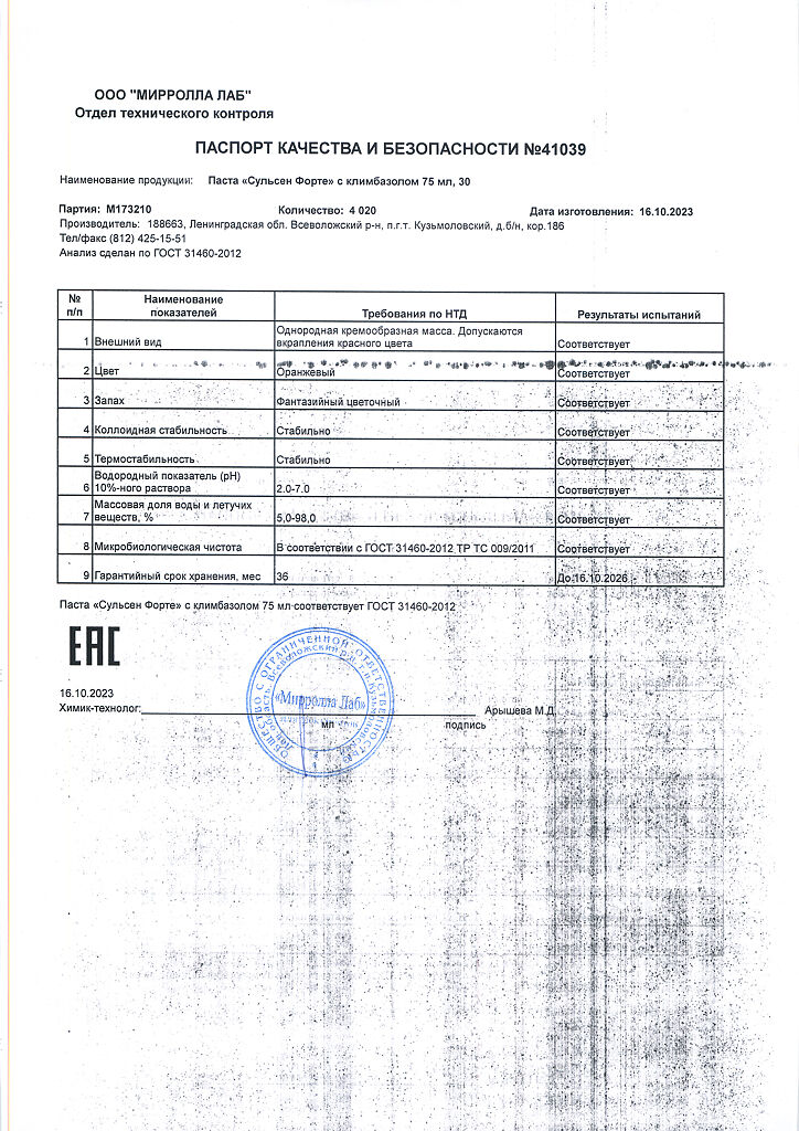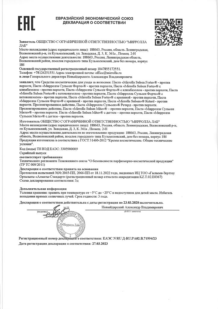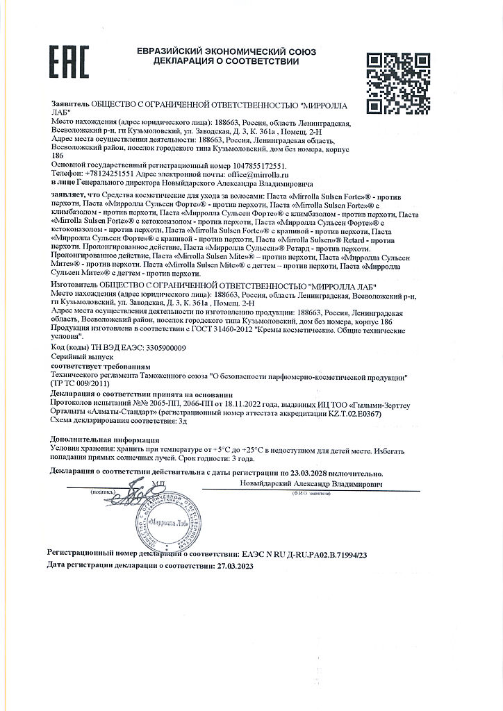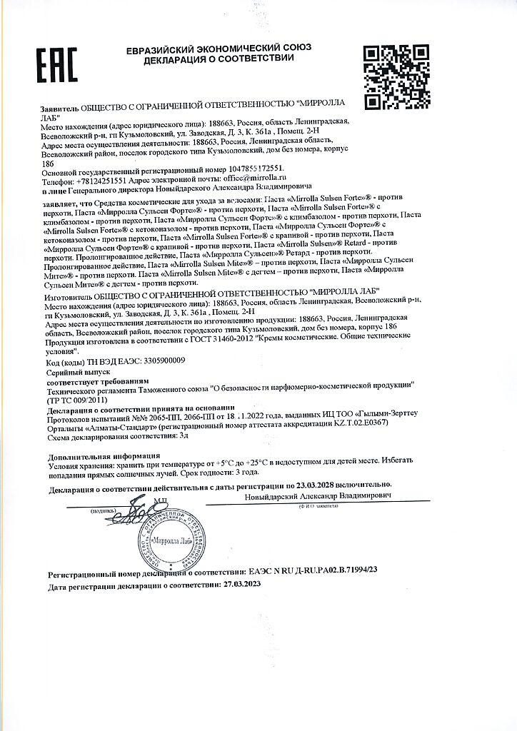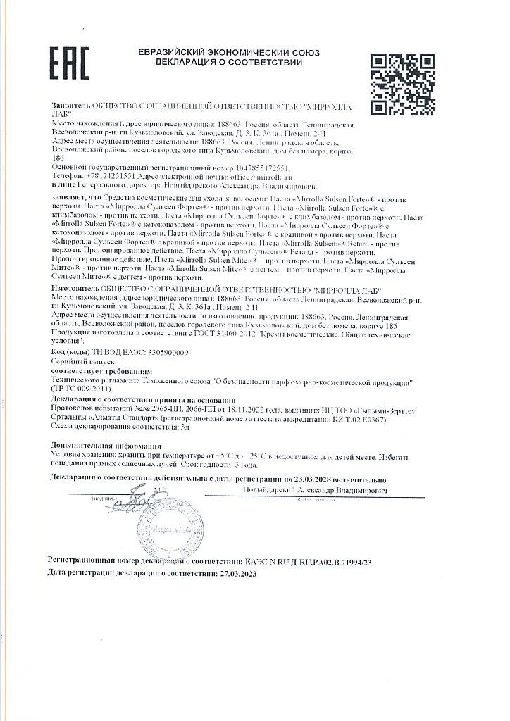 Документы Mirrolla Сульсен Форте паста для волос с климбазолом против перхоти 75 мл 1 шт