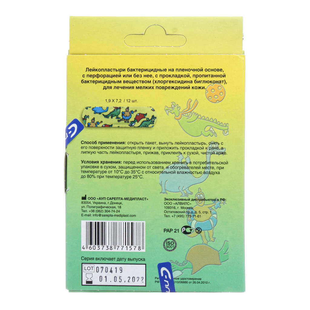 Набор бактерицидных лейкопластырей на пленочной основе с веселыми картинками дракончиков станут веселой игрой для обработки мелких порезов кожи ребенка.