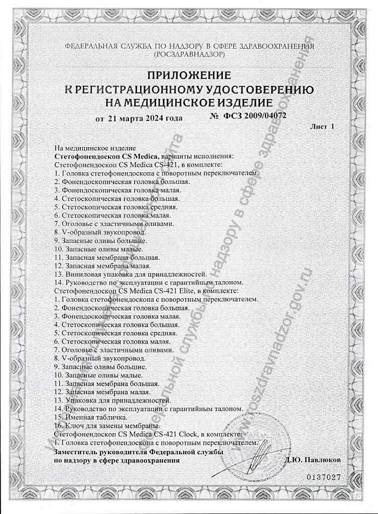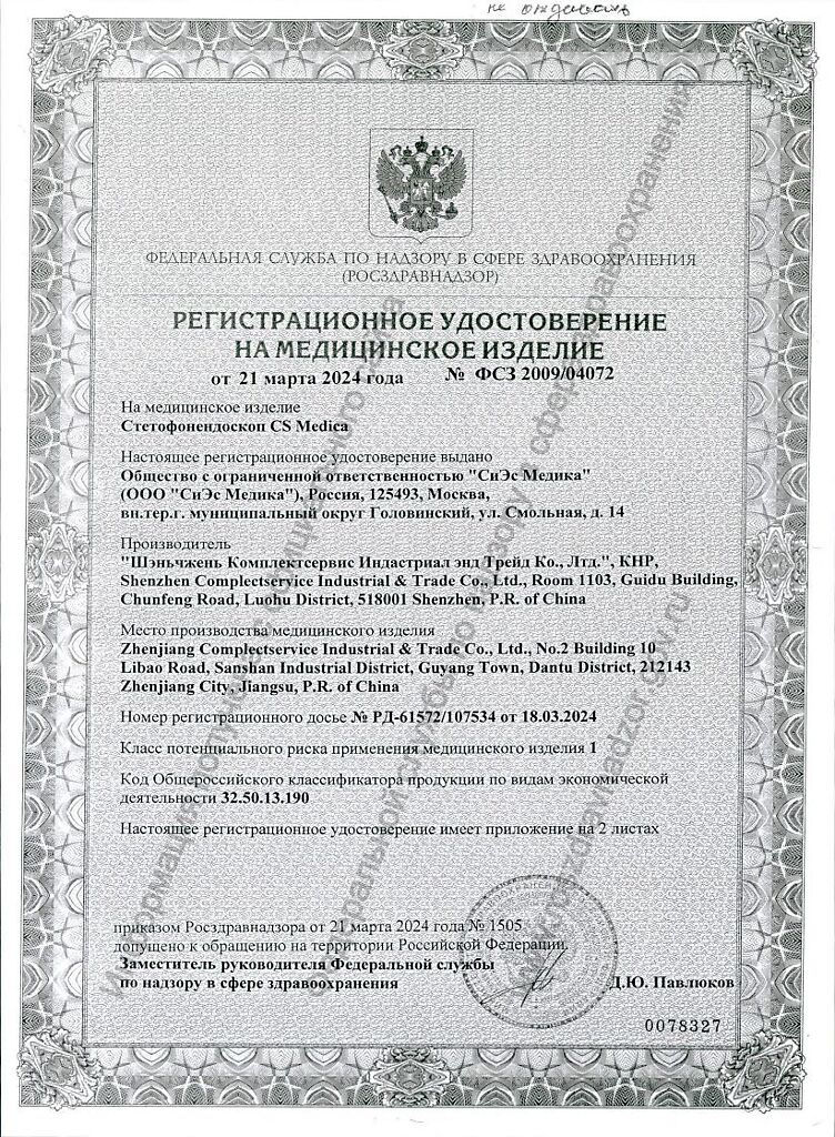 CS Меdica CS 421 предназначен для прослушивания разных тонов сердца и других органов. Удлиненные трубки (56 см) не ограничивают свобод ваших движений. Вы и ваш пациент чувствуете себя более комфортно при осмотре. Лучшие акустические характеристики, достигнутые благодаря использованию более мягкой резины и усовершенствованной технологии при изготовлении трубок, позволят вам легко различить самые незначительные отличия в тонах и шумы. Индивидуальная адаптируемость стетофонендоскопа (наличие взаимозаменяемых внутриушных наконечников различного размера)избавит вас от неприятных ощущений при постоянном использовании стетофонендоскопа. Нагрудные части в форме колокола (3-х размеров) поставляемые в дополнение к 2 оригинальным диафрагмам (большой и малой) обеспечивают многофункциональность комплекта. Каждая диафрагма или колокообразная чашечка служат для определенной цели, а вместе они охватывают все области применения. Таким образом, благодаря 5-ти вариантам рабочей комплектации стетофонендоскоп заменяет все остальные стетофонендоскопы. Большая и чувствительная диафрагма обеспечивает высокую разрешающую способность при аускультации сердечно-сосудистой системы, органов дыхания, а также внутренних органов брюшной полости. Малая диафрагма предназначена для, прослушивания сердца у детей, когда в сердцебиении преобладают высокие тона. Колоколообразная чашечка взрослого размера очень полезна для точного определения низких и средних тонов или шумов. Чашечка среднего размера позволяет сконцентрировать звук в узких, небольших участках (например, в межреберных промежутках). Предназначается для прослушивания низких и средних тонов или шумов. Чашечка детского размера прекрасно подходит для осмотра детей и подростков. Низкие и средние тона, а также шумы детского сердца хорошо улавливаются этой чашечкой. Вы убедитесь, что все названные комбинации хорошо продуманы, а высокая чувствительность стетофонендоскопа позволяет вам четко выслушивать тоны сердца, а также легко слышать даже самые слабые шумы. Дополнительные внутриушные наконечники трех размеров позволят вам выбрать наиболее подходящую для вас пару и чувствовать себя комфортно при частом пользовании стетофонендоскопом.