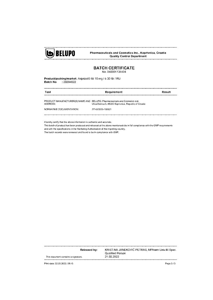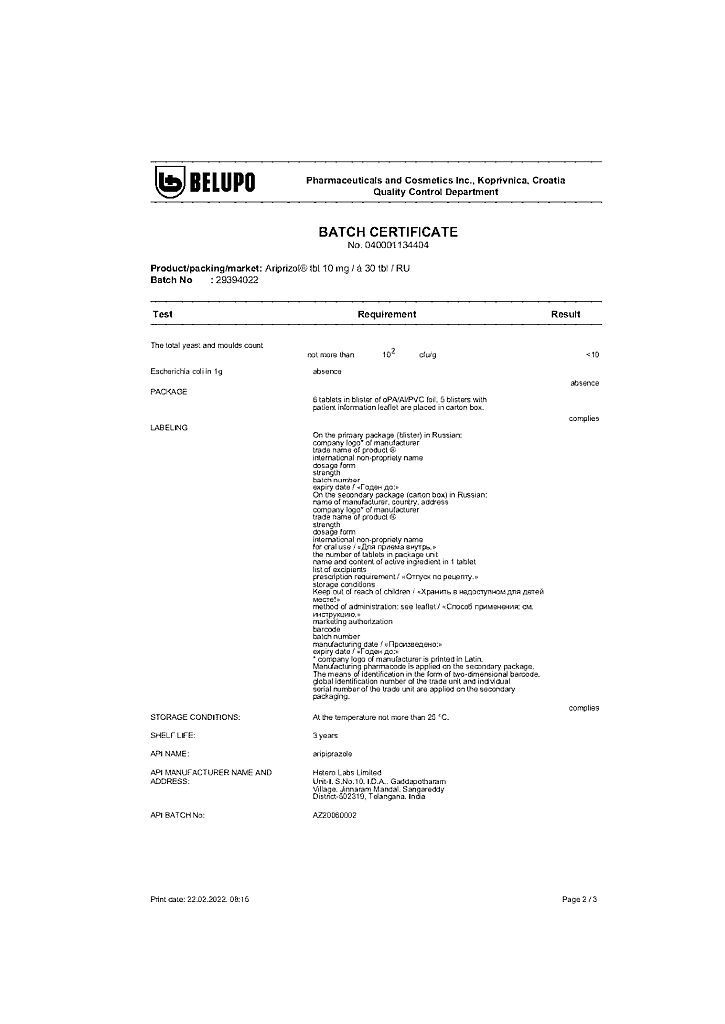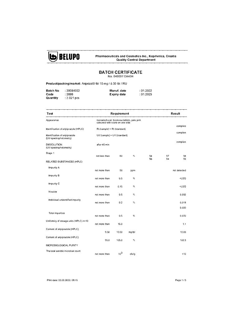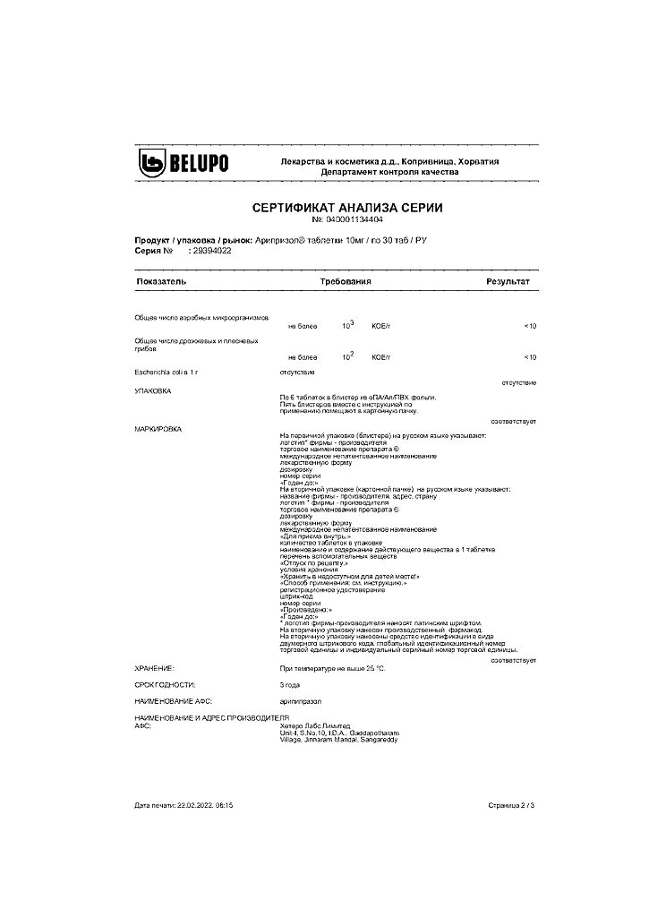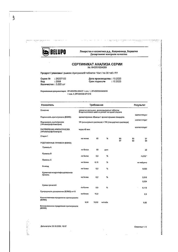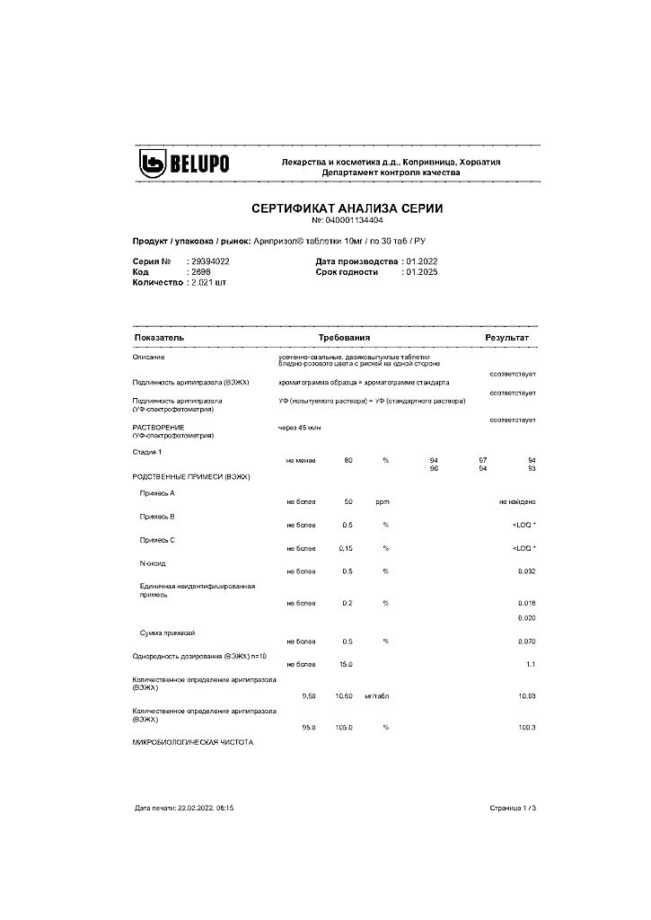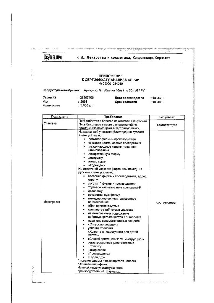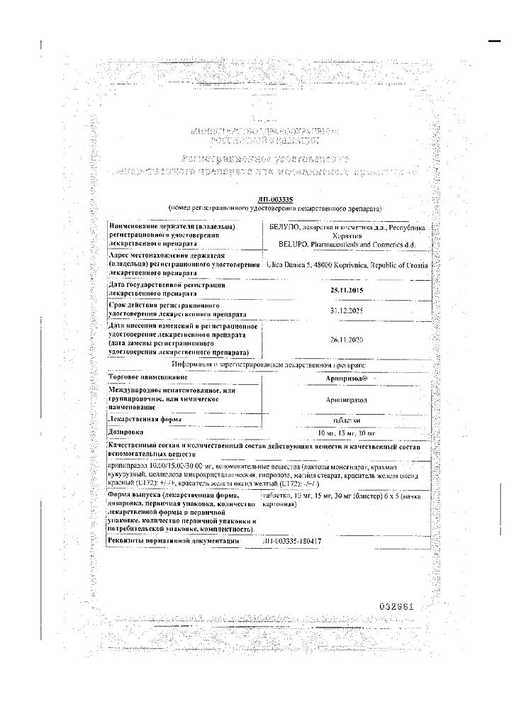 арипипразол 10,00 / 15,00 / 30,00 мг.