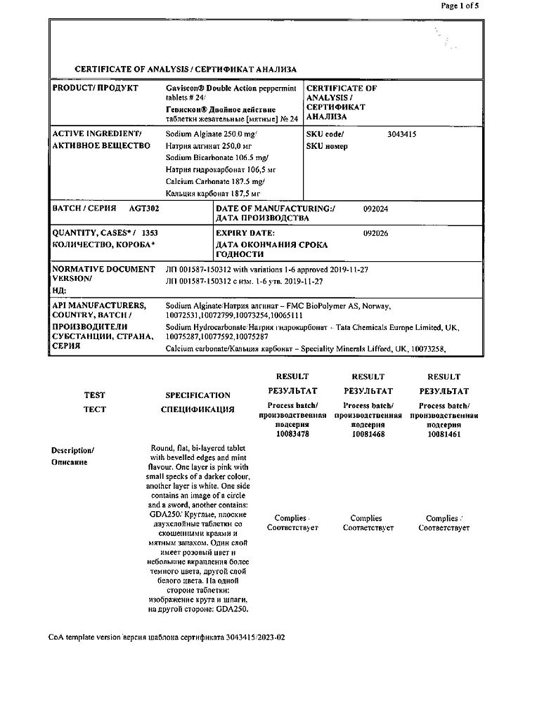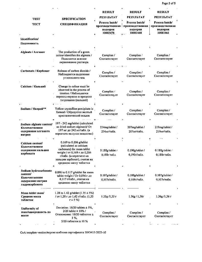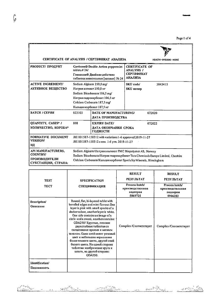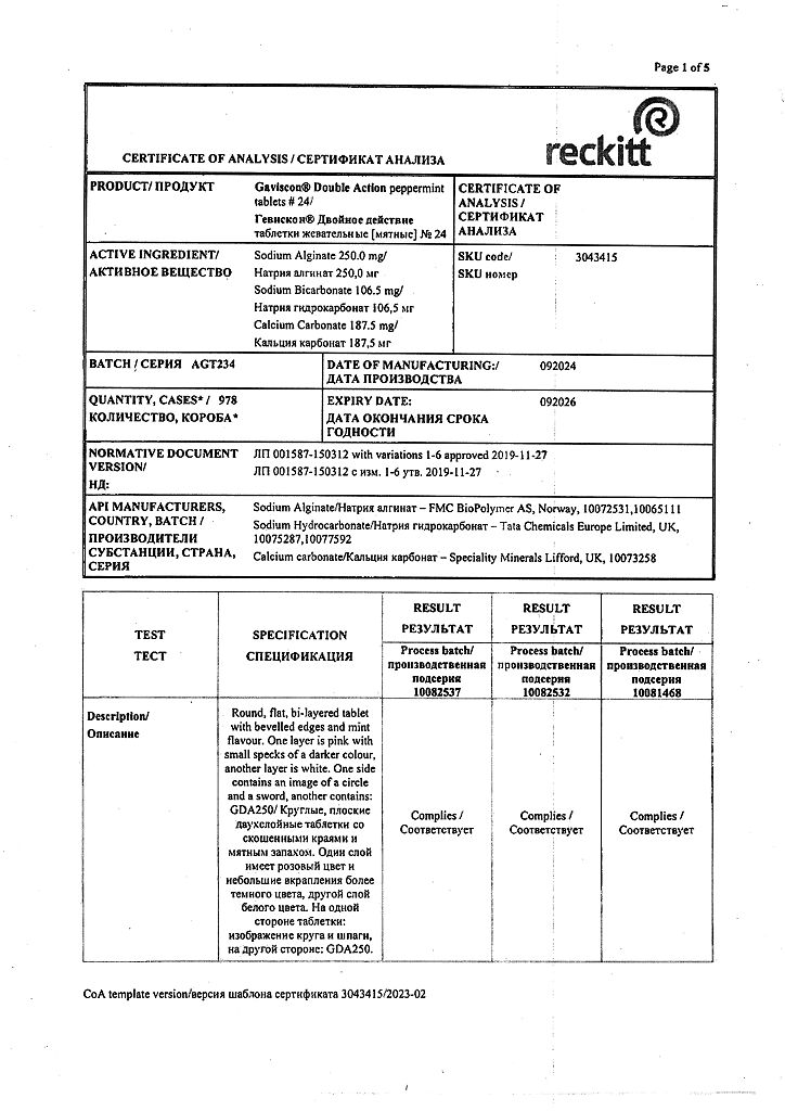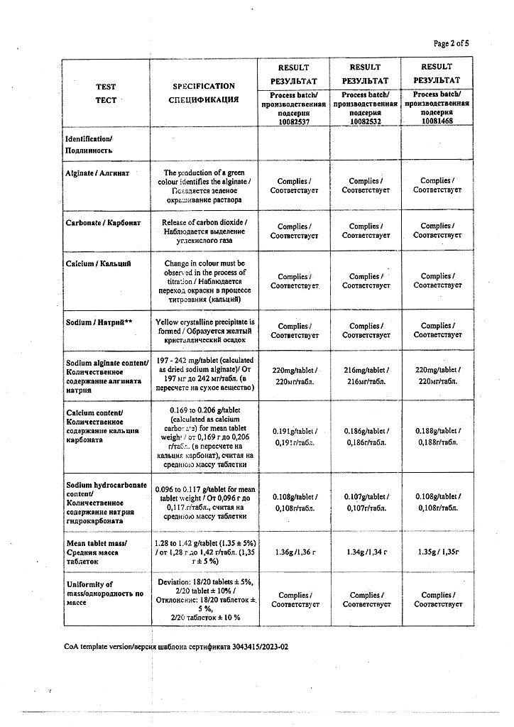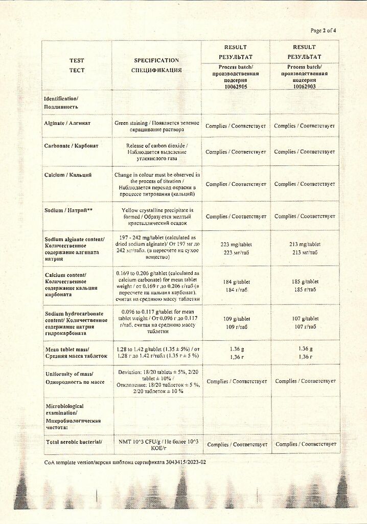 Действующее вещество: Натрия алгинат, Натрия гидрокарбонат, Кальция карбонат