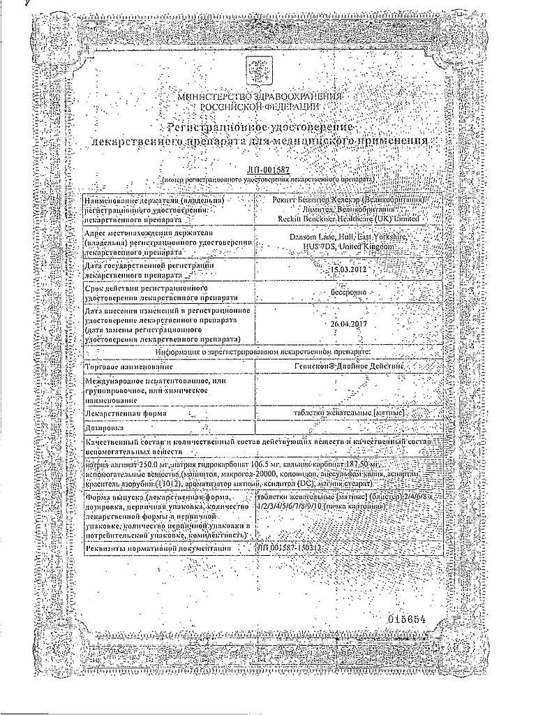 Так как кальция карбонат, входящий в состав препарата, проявляет антацидную активность, то между приемом препарата Гевискон® Двойное Действие и других препаратов должно пройти не менее 2 часов, особенно при одновременном приеме с блокаторами Н2-гистаминовых рецепторов, антибиотиками из группы тетрациклина, дигоксином, фторхинолоном, солями железа, кетоконазолом, нейролептиками, тиреоидными гормонами, левотироксином натрия, пеницилламином, бета-адреноблокаторами (атенолол, метопролол, пропранолол), глюкокортикостероидами, хлорохином, бисфосфонатами и эстрамустином.