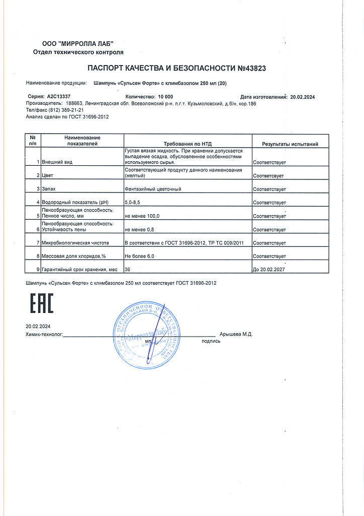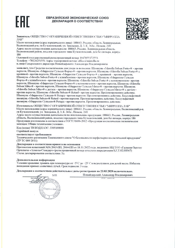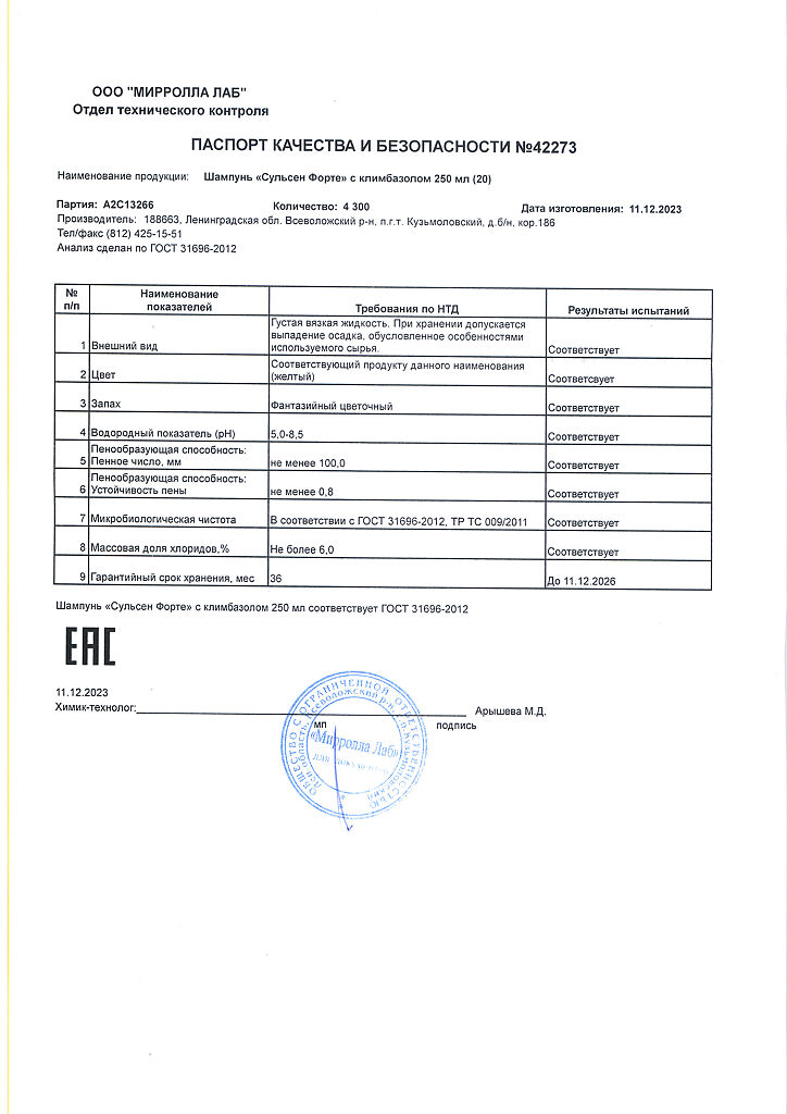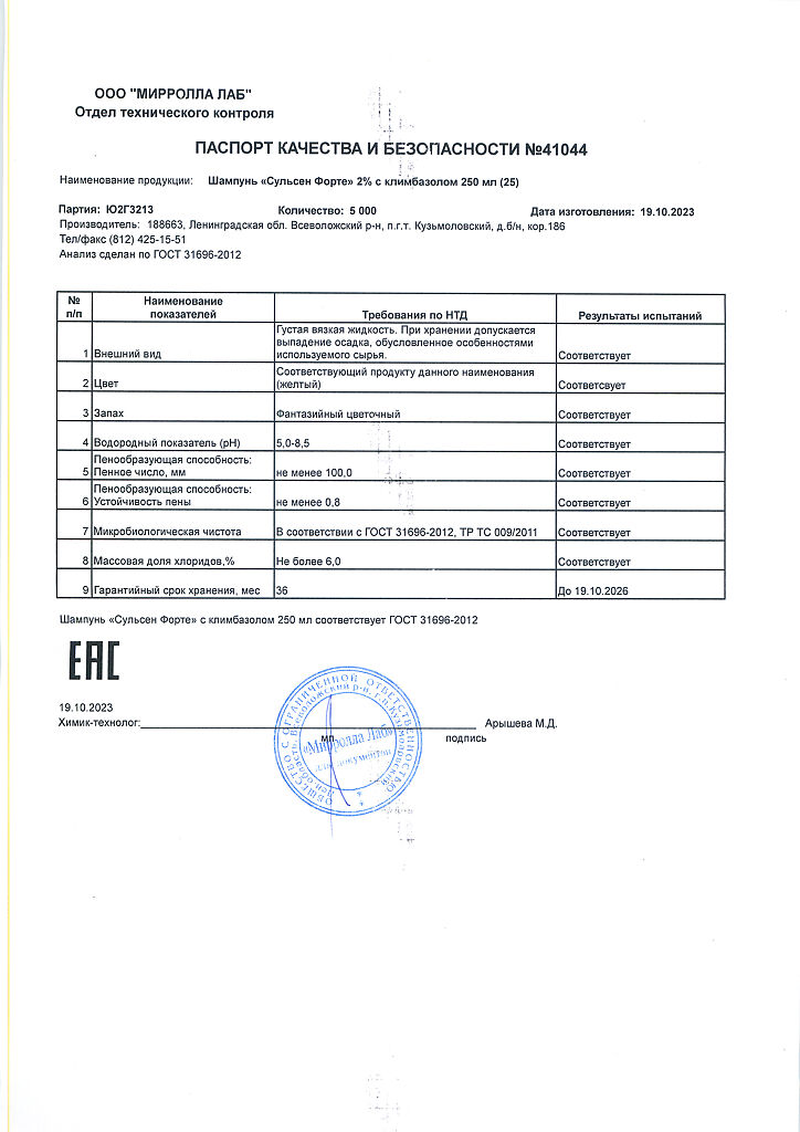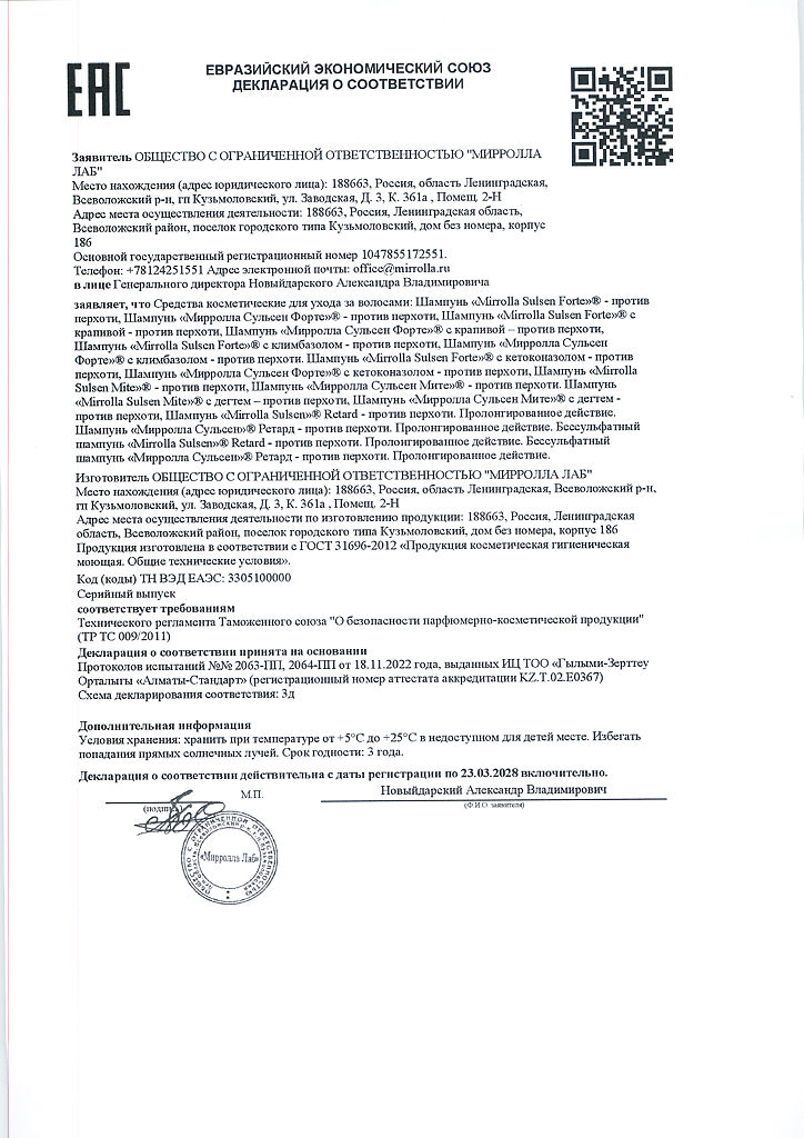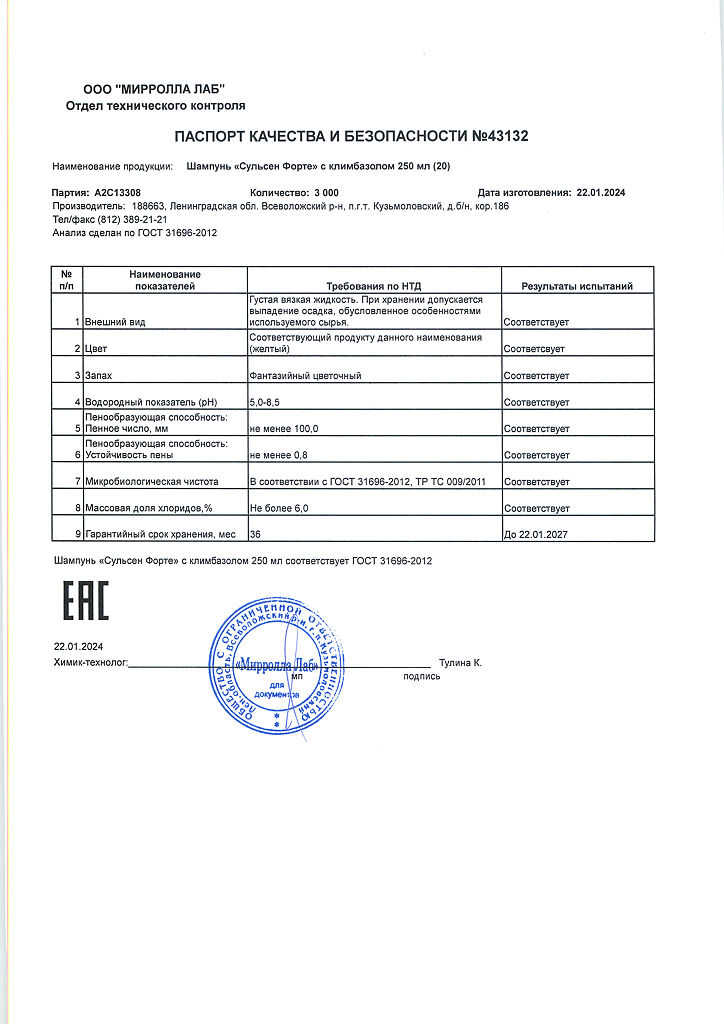 Документы Mirrolla Сульсен Форте шампунь с климбазолом 250 мл 1 шт