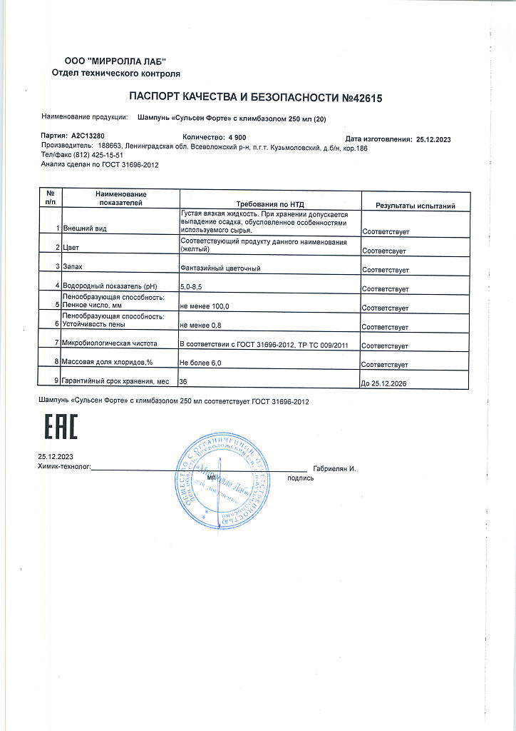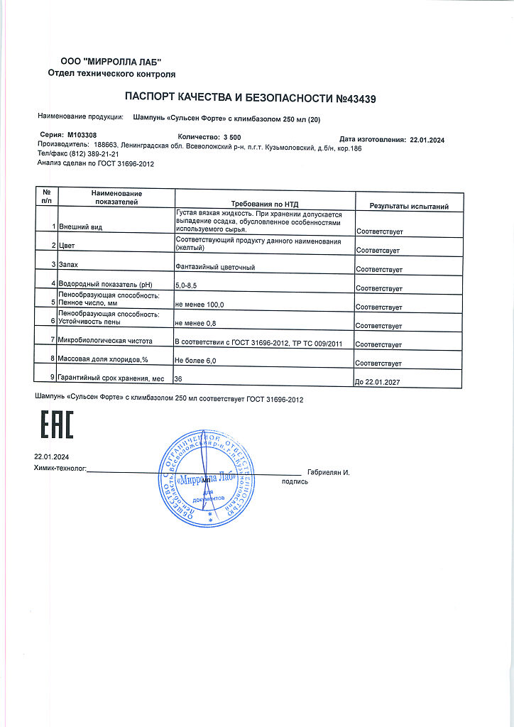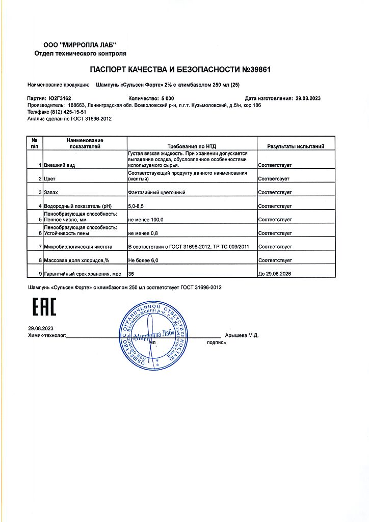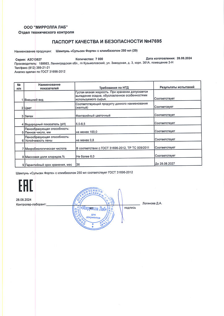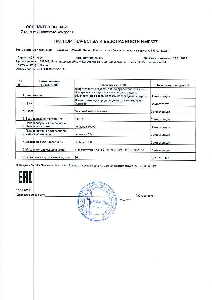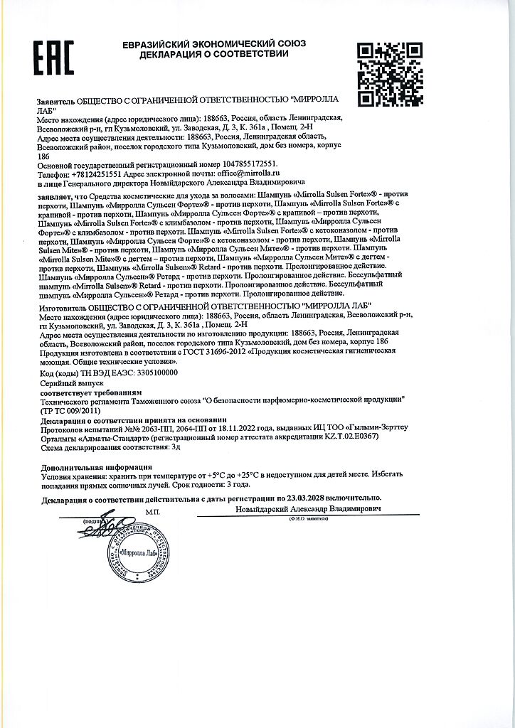 Документы Mirrolla Сульсен Форте шампунь с климбазолом 250 мл 1 шт