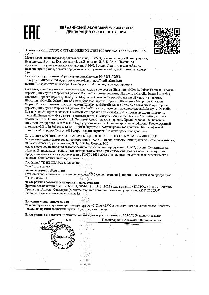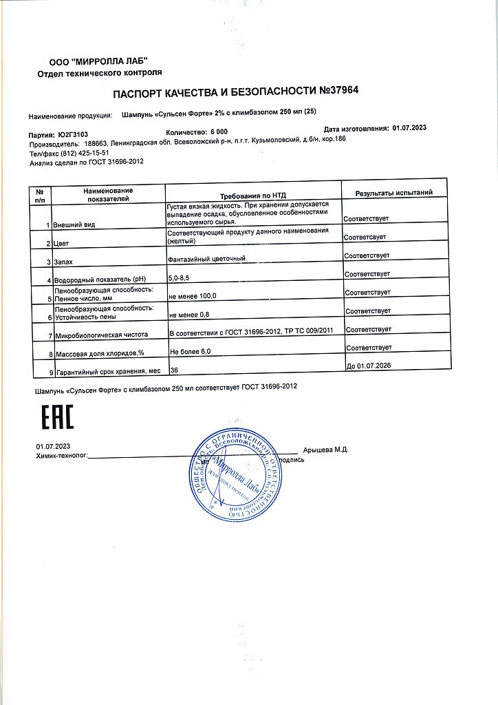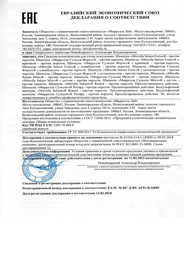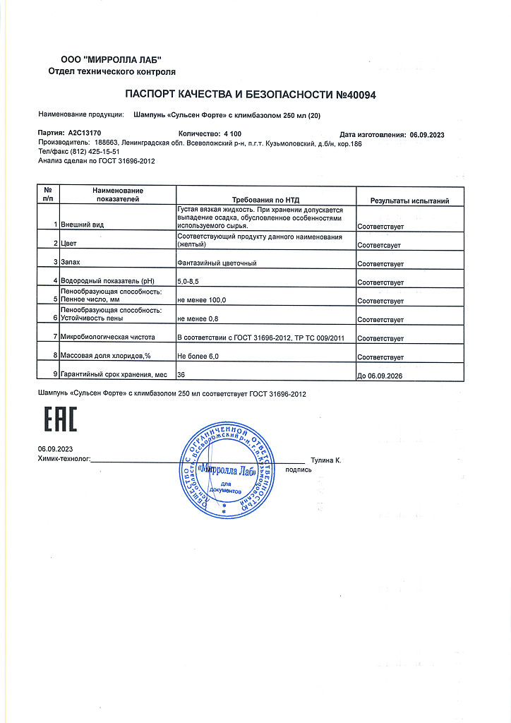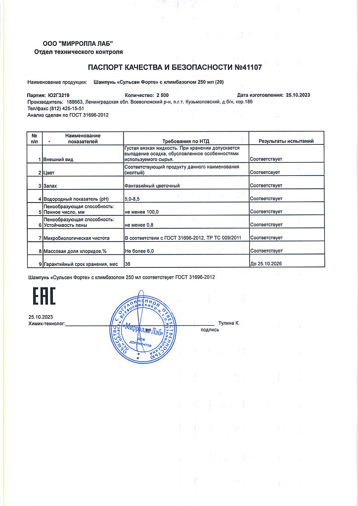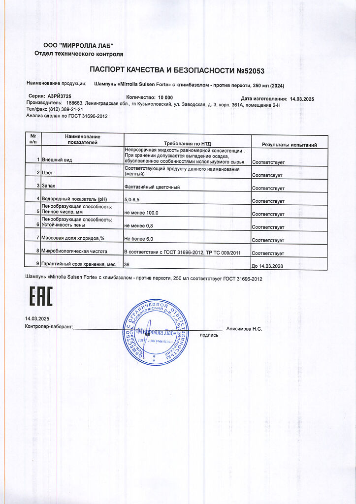 Документы Mirrolla Сульсен Форте шампунь с климбазолом 250 мл 1 шт