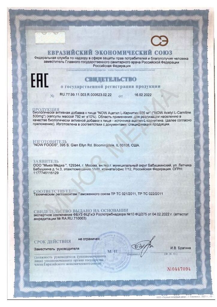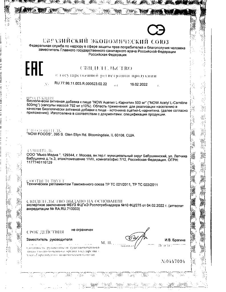 Документы Now Ацетил-L-Карнитин 500 мг / Acetyl-L-Carnitine 500 mg капсулы массой 792 мг 50 шт