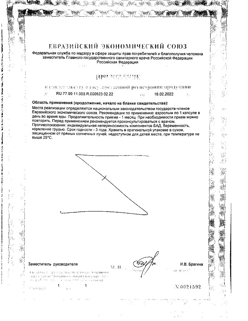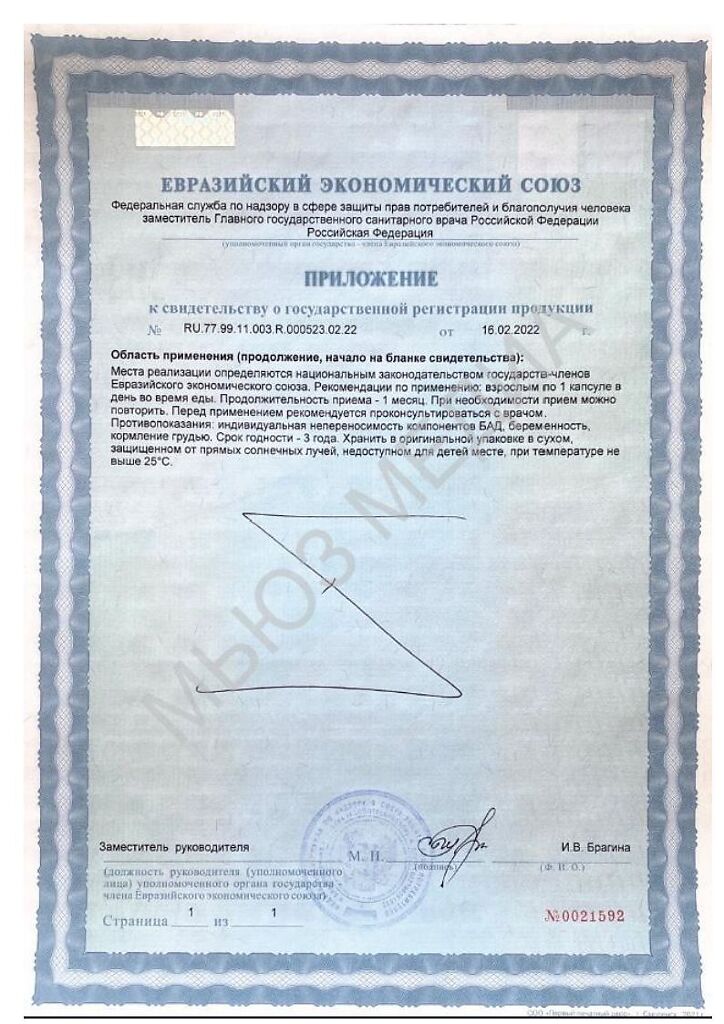 Вспомогательные компоненты: Оболочка капсулы (гипромеллоза), рисовая мука, стеариновая кислота (Е507, стабилизатор), диоксид кремния (Е551, агент антислеживающий)