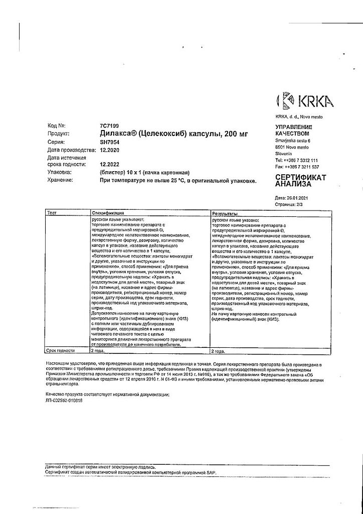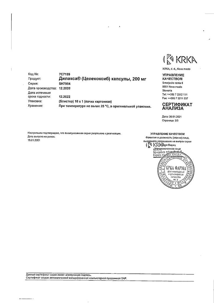 Целекоксиб, как и все коксибы, может увеличивать риск развития серьезных осложнений со стороны сердечно-сосудистой системы, таких как тромбообразование, инфаркт миокарда и инсульт, которые могут привести к летальному исходу. Риск развития этих реакций возрастает с увеличением дозы, длительности приема препарата, а также у пациентов с заболеваниями сердечно-сосудистой системы или с факторами риска развития сердечно-сосудистых заболеваний. С целью снижения риска развития этих реакций препарат Дилакса® следует применять в минимальных эффективных дозах и минимально возможным коротким курсом (на усмотрение лечащего врача). Лечащий врач и пациент должны учитывать возможность развития таких осложнений даже при отсутствии ранее известных симптомов нарушения функции сердечно-сосудистой системы. Пациенты должны быть информированы о симптомах серьезных нежелательных эффектов со стороны сердечно-сосудистой системы и о мерах, которые следует предпринять в случае их возникновения.