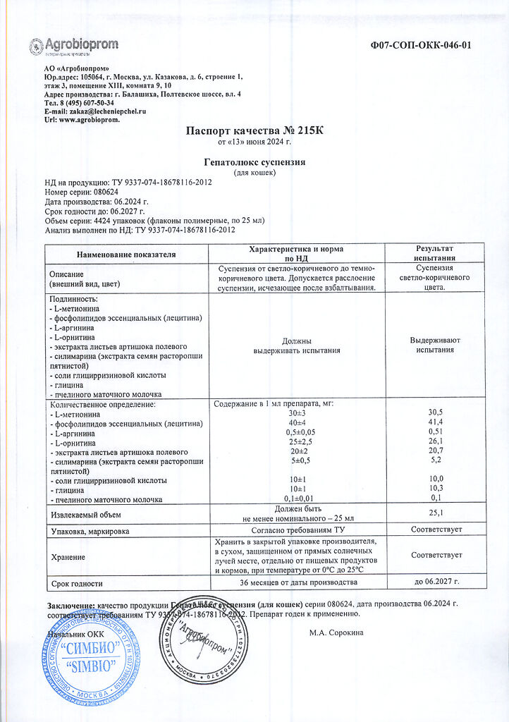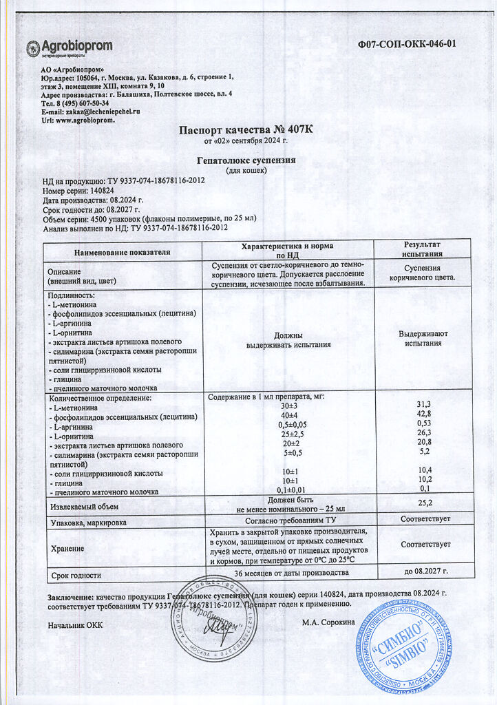 Активные компоненты препарата Гепатолюкс способствуют нормализации белкового, углеводного и жирового обмена, обладают выраженными гепатопротекторными свойствами, повышают антиоксидантную, барьерную, гомеостатическую и метаболическую функцию печени. Экстракты лекарственных растений оказывают желчегонное, гиполипидемическое и гипогликемическое (понижение уровня сахара в крови) действие, ускоряют процесс депонирования веществ в печени. Метионин является незаменимой аминокислотой, которая регулирует азотистый баланс в организме. Содержит подвижную метильную группу и участвует в процессах метилирования, обеспечивающих синтез холина, адреналина, креатина и др. биологически важных соединений, обезвреживания токсичных продуктов и образования фосфолипидов. Тормозит отложение в печени нейтрального жира, оказывает липотропный эффект (удаление из печени избытка жира). Фосфолипиды эссенциальные (лецитин) относятся к классу высокоспециализированных липидов и представляют собой сложные эфиры глицерофосфорной кислоты. Являются основными элементами в структуре клеточной оболочки и митохондрий, регулируют липидный и углеводный обмен, улучшают функциональное состояние печени и ее дезинтоксикационную функцию, способствуют сохранению и восстановлению структуры гепатоцитов; тормозят формирование соединительной ткани в печени. L-аргинин – алифатическая аминокислота, которая ускоряет выведение из организма продуктов белкового обмена, снижает уровень холестерина, улучшает работу ферментативных систем и трофику тканей. Экстракт листьев артишока полевого обладает желчегонным, дезинтоксикационным, гепатопротективным, гиполипидемическим и диуретическим действием. Повышает выведение из организма мочевины, токсинов (нитросоединений, алкалоидов, солей тяжелых металлов), способствует уменьшению содержания холестерина в крови. Экстракт расторопши пятнистой (силимарин) обладает антиоксидантными и мембраностабилизирующими свойствами, препятствует накоплению гидроперекисей липидов, тем самым уменьшает повреждения клеток печени и замедляет поступление в них токсических веществ. А также активирует и нормализует белковый и жировой обмен. Соль глицирризиновой кислоты стимулирует желчеотделение и улучшает функционирование печени, оказывает противовирусное, спазмолитическое и противовоспалительное действие. Глицин является регулятором обмена веществ, нормализует и активирует процессы защитного торможения в центральной нервной системе, повышает выносливость животного. Оказывает антиоксидантное и антитоксическое действие. Экстракт пчелиного маточного молочка способствует быстрому восстановлению и выведению токсических веществ, ядов и тяжелых металлов из организма, нормализует внутриорганное давление, повышает иммунную систему, улучшает функцию почек и печени, снижает уровень сахара в крови, а также оказывает выраженное противовоспалительное, гепатопротекторное, кардиопротекторное и адаптогенное действие.
