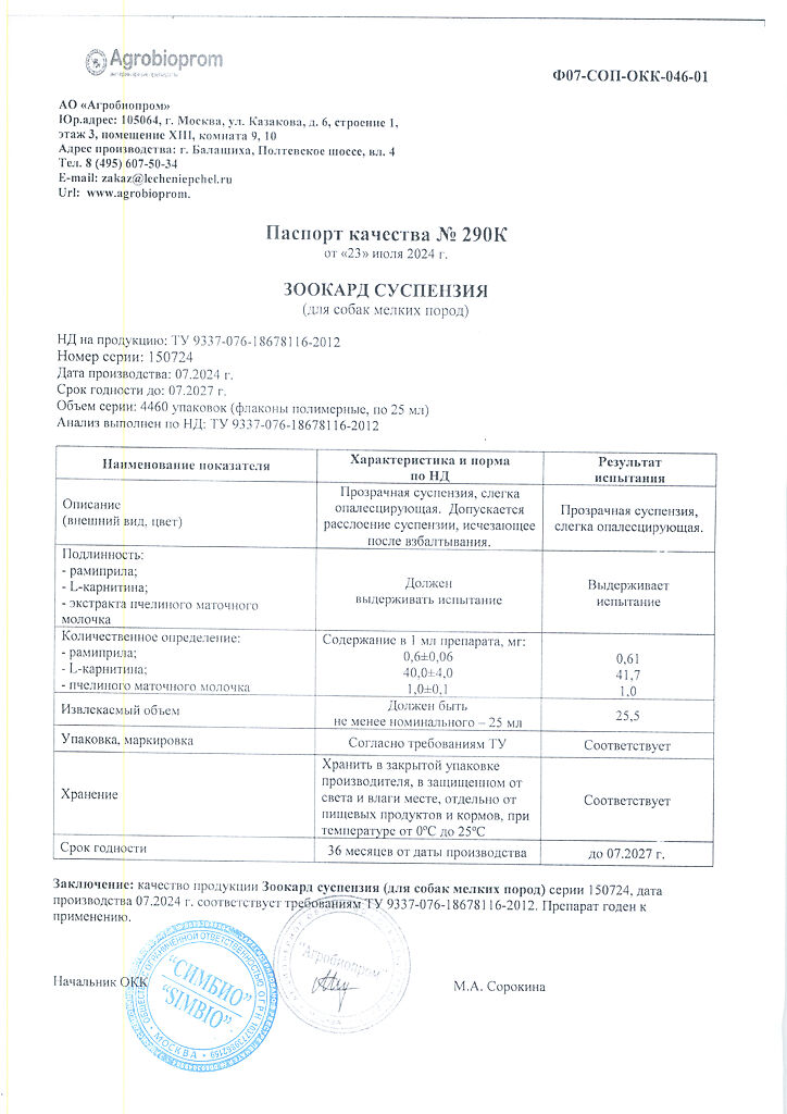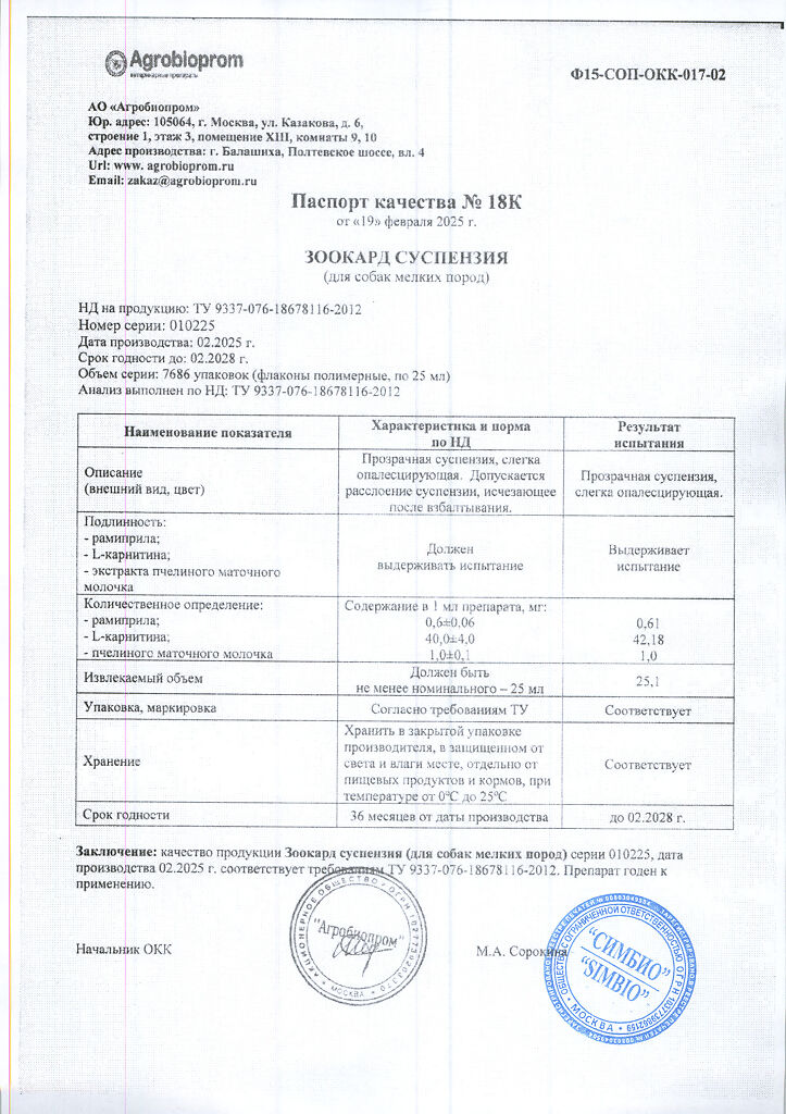 ЗООКАРД — комплексный кардиопротектор нового поколения для лечения застойных явлений в организме, вызникающих при хронической сердечной недостаточности, артериальной гипертензии, почечной недостаточности, кардиомиопатиях различного генеза, а также для профилактики ишемии миокарда у животных.