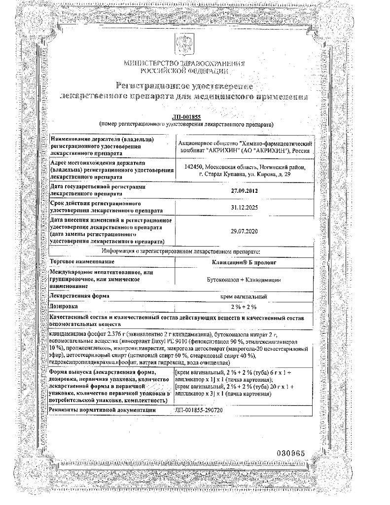 Рекомендуемая доза составляет 1 полный аппликатор (5 г крема, что соответствует 100 мг бутоконазола нитрата и 100 мг клиндамицина). Курс лечения - ежедневно в течение 3 дней.