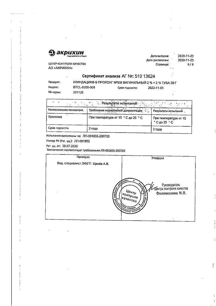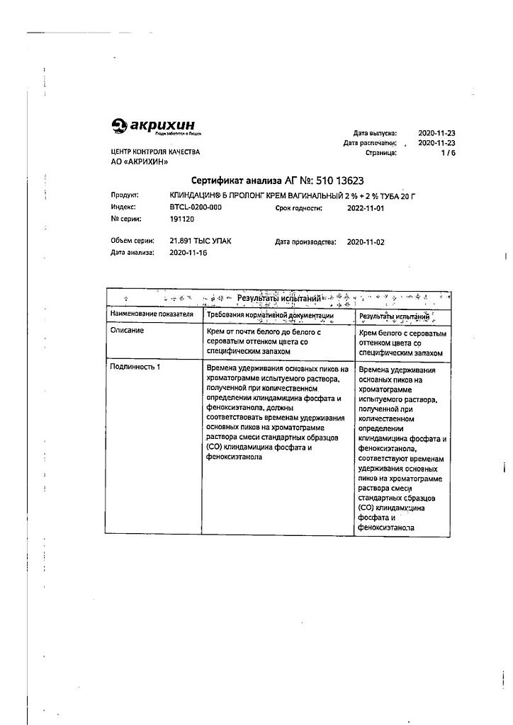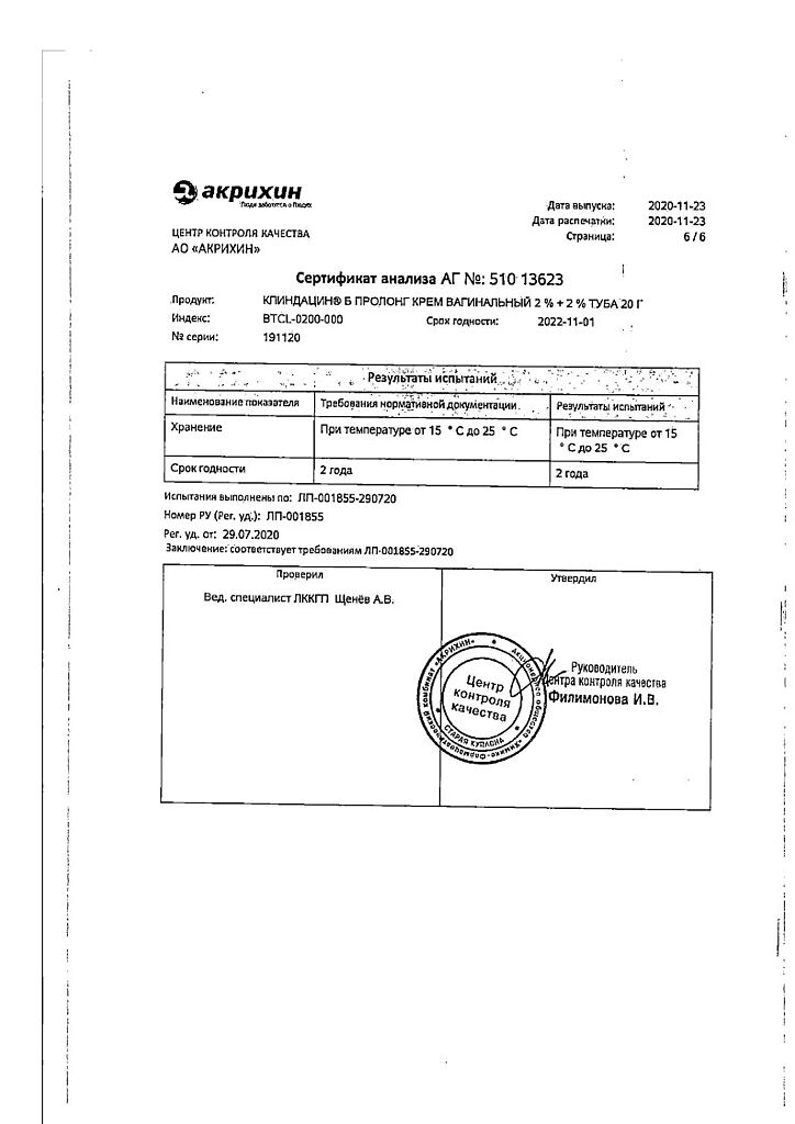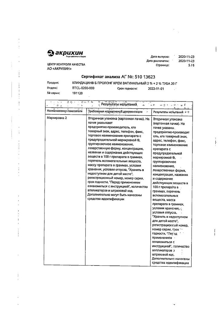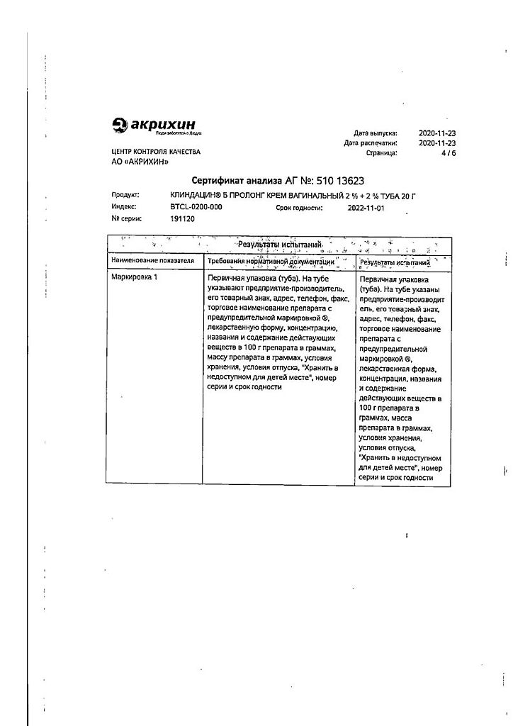 После применения клиндамицина интравагинально в дозе 100 мг/сут однократно (в виде 2% крема клиндамицина фосфата) в течение 7 дней Сmах клиндамицина в плазме крови достигается через 10 ч (4-24 ч) и составляет в 1-й день в среднем 18 нг/мл (4-47 нг/мл), а на 7-й день - 25 нг/мл (6-61 нг/мл), при этом системная абсорбция составляет около 4% (0.6-11%) от введенной дозы.
