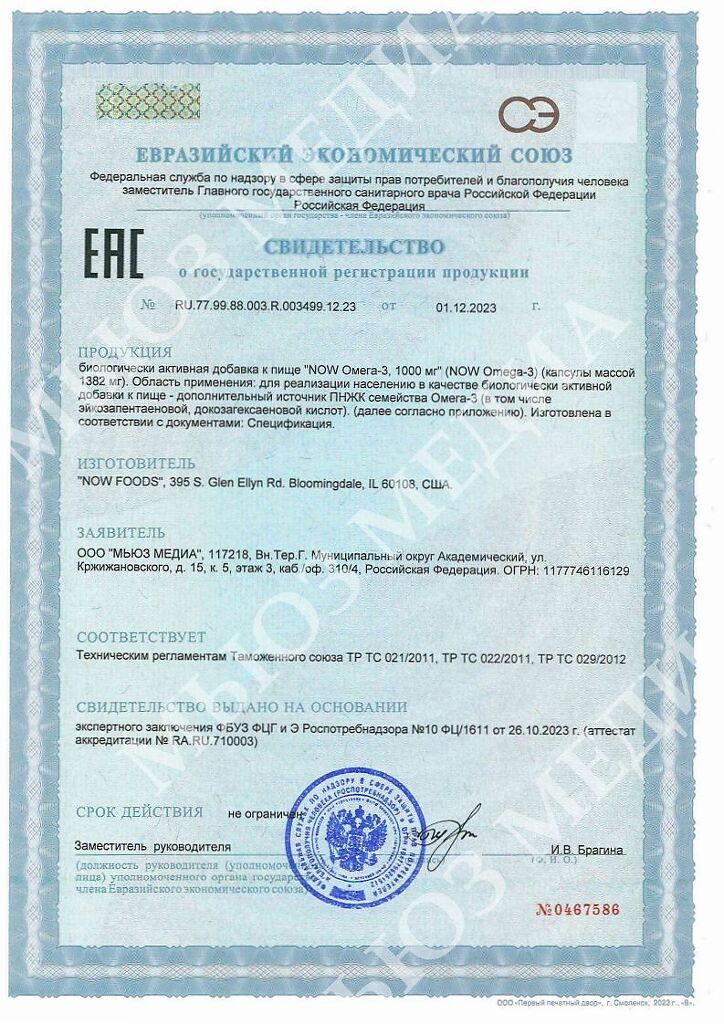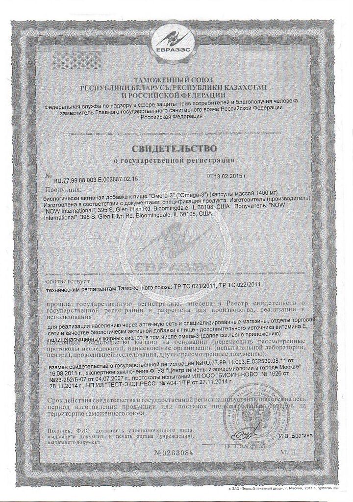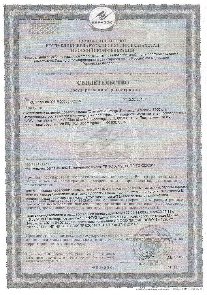 Документы Now Омега-3 / Omega-3 1000 мг капсулы массой 1382 мг 200 шт