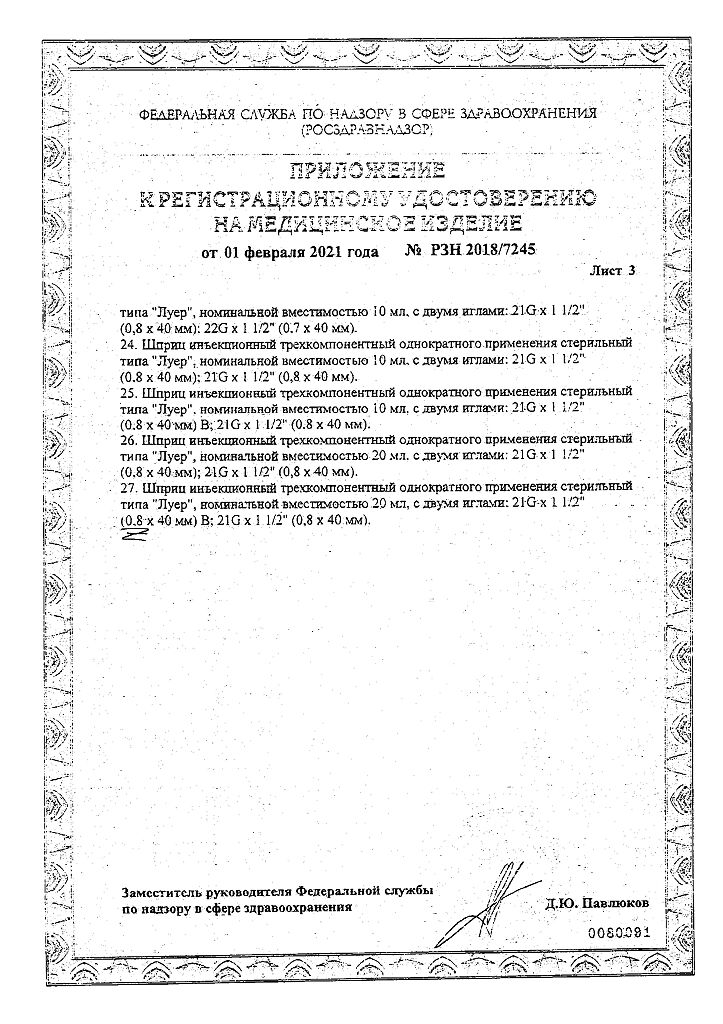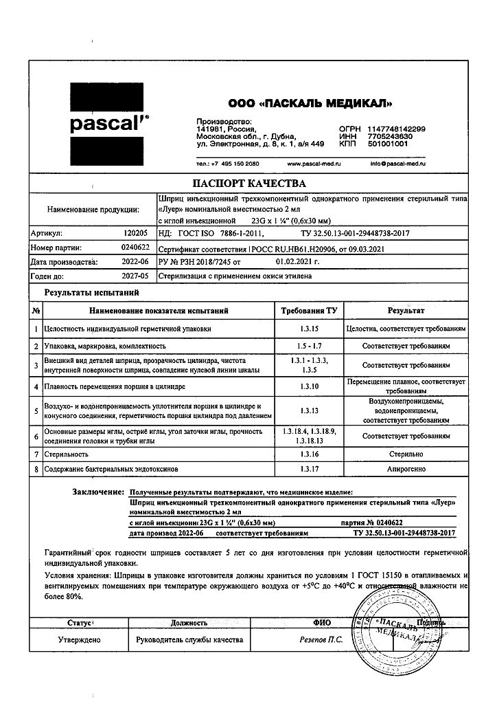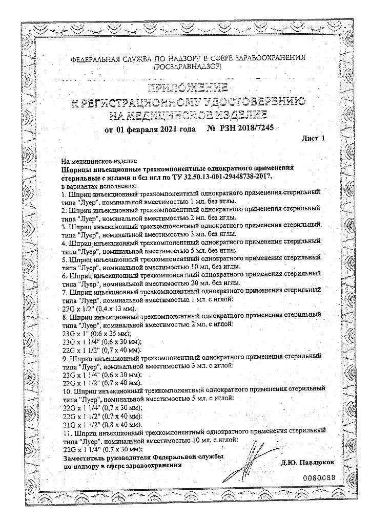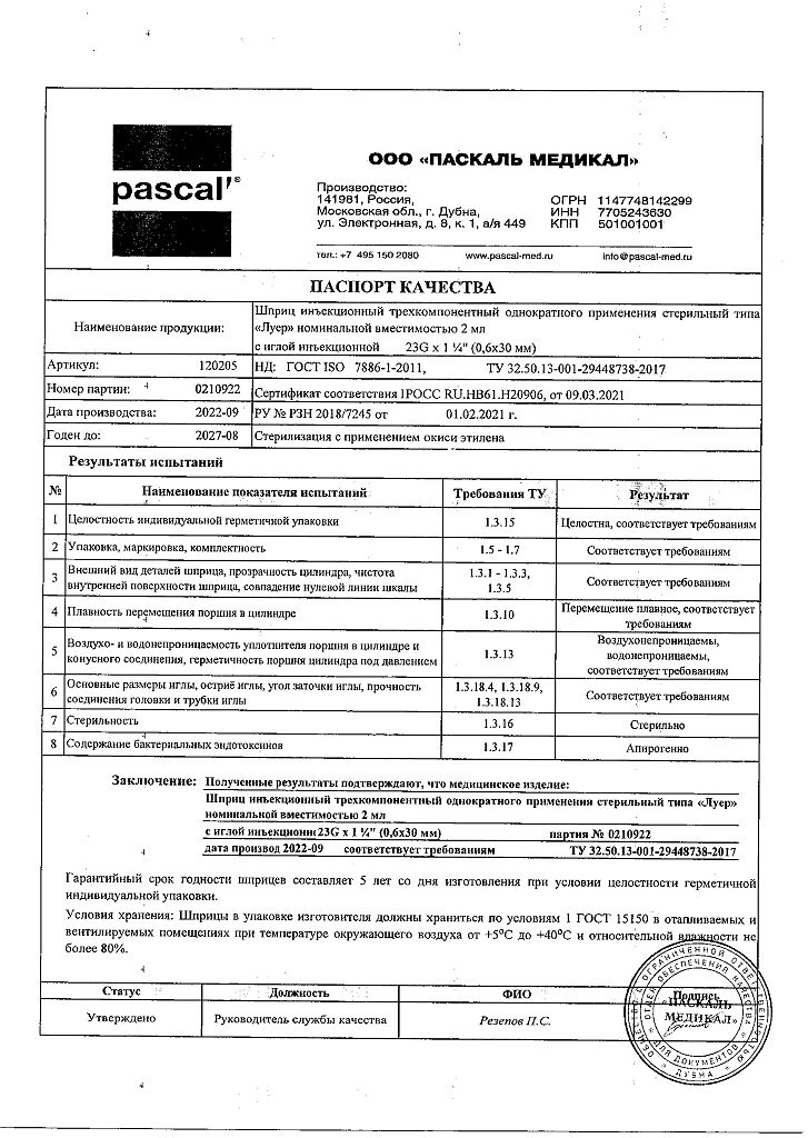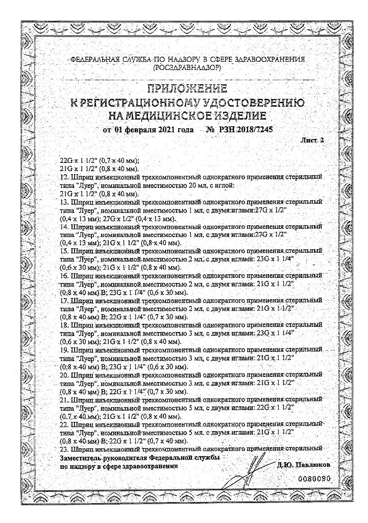 Документы Шприц 3-х компонентный Pascal 2 мл с иглой 23G (0,6х30 мм) 10 шт