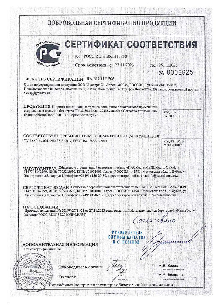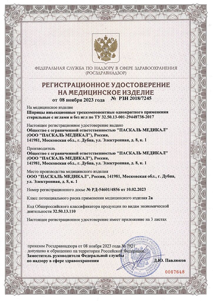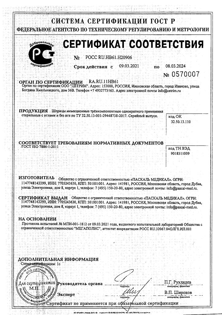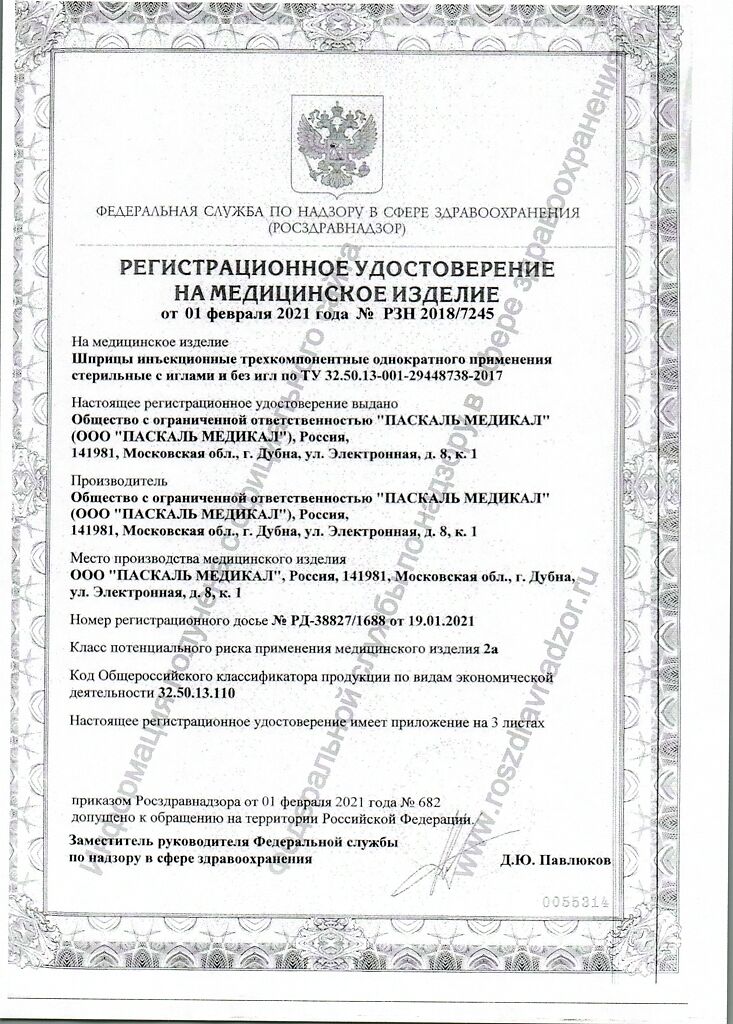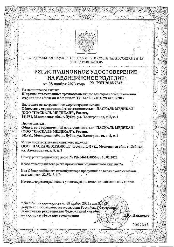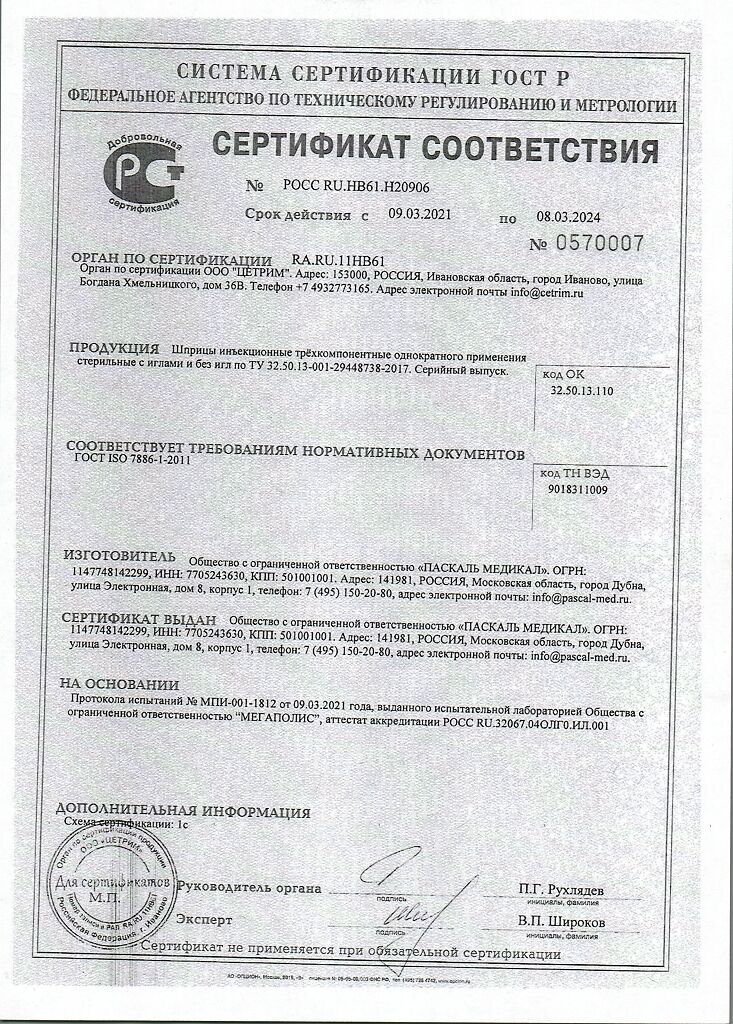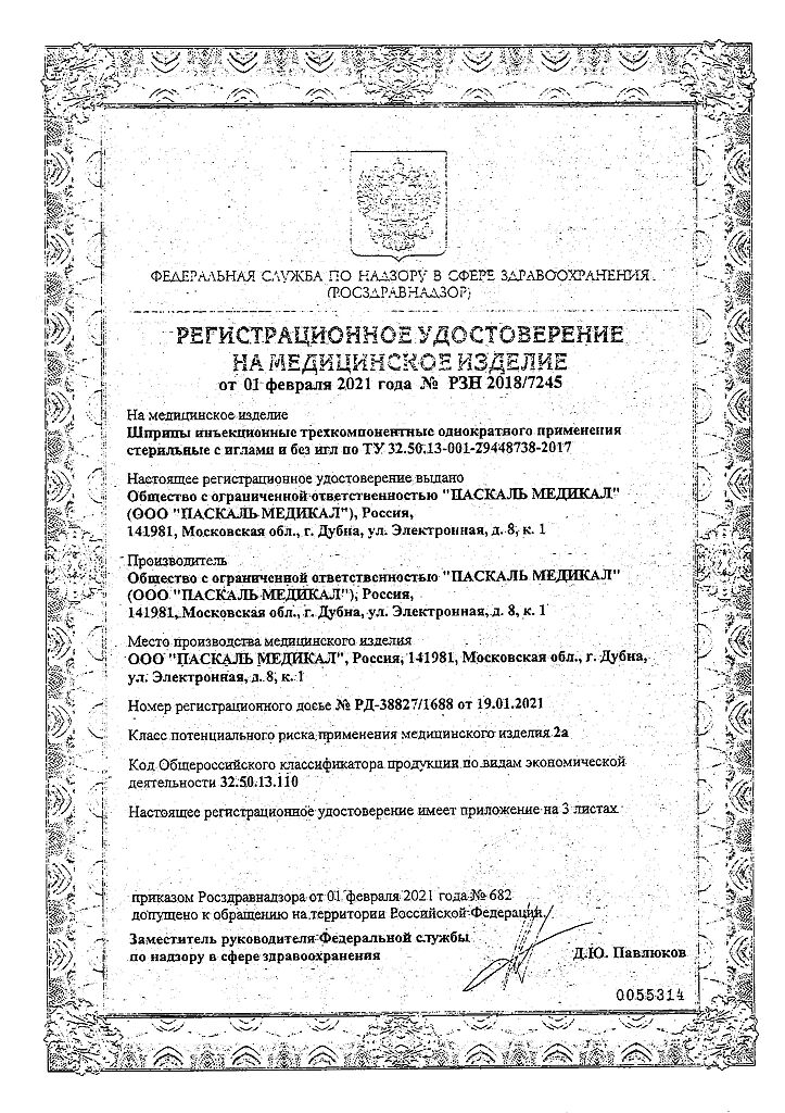 Шприц инъекционный 3-х компонентный однократного применения стерильный ТМ PASCAL'. Цилиндр полностью прозрачный для хорошей визуализации содержимого. Шкала хорошо читаемая. Расположена строго параллельно вертикальной оси цилиндра. Манжета не содержит латекс для предотвращения аллергических реакций. Игла инъекционная со стандартным срезом. Шприц упакован в индивидуальную блистерную упаковку с отогнутым краем, которая вскрывается с небольшим усилием, что предотвращает самопроизвольное вскрытие, и без образования бумажной бахромы.