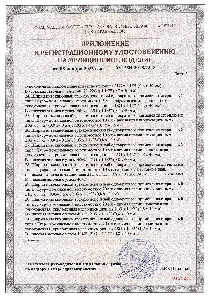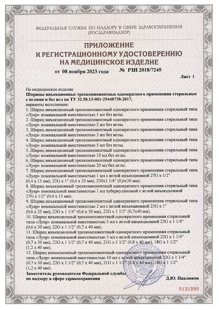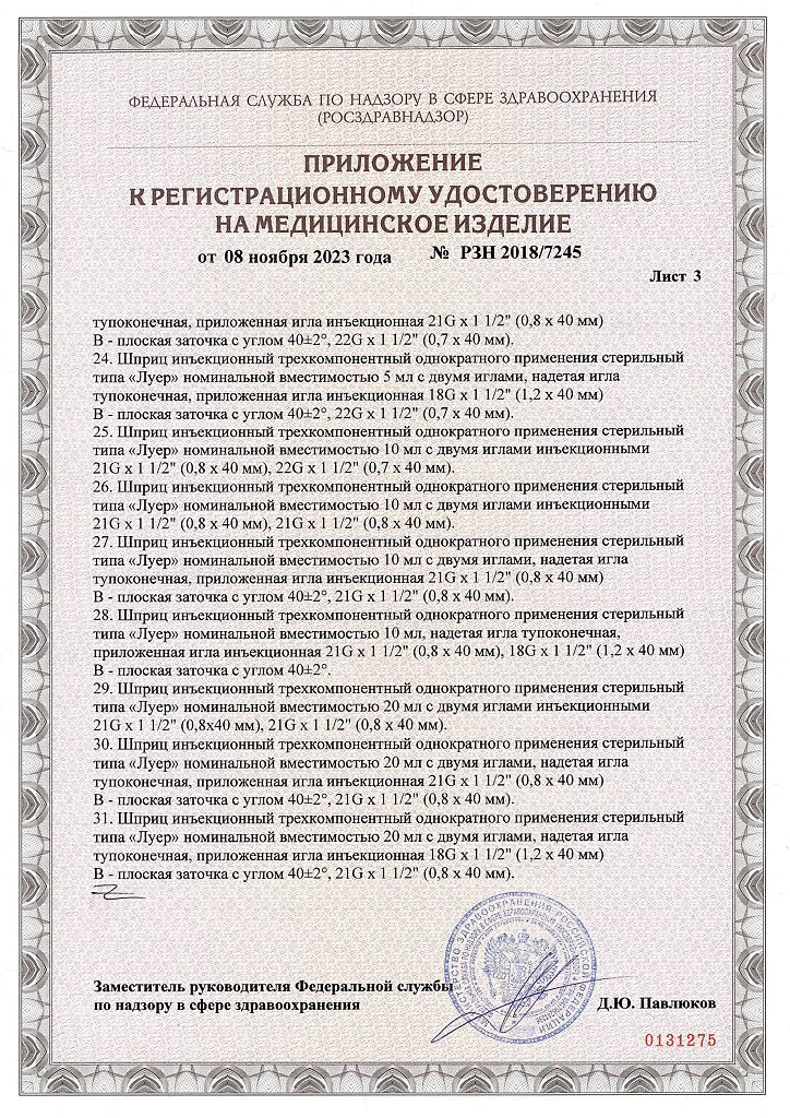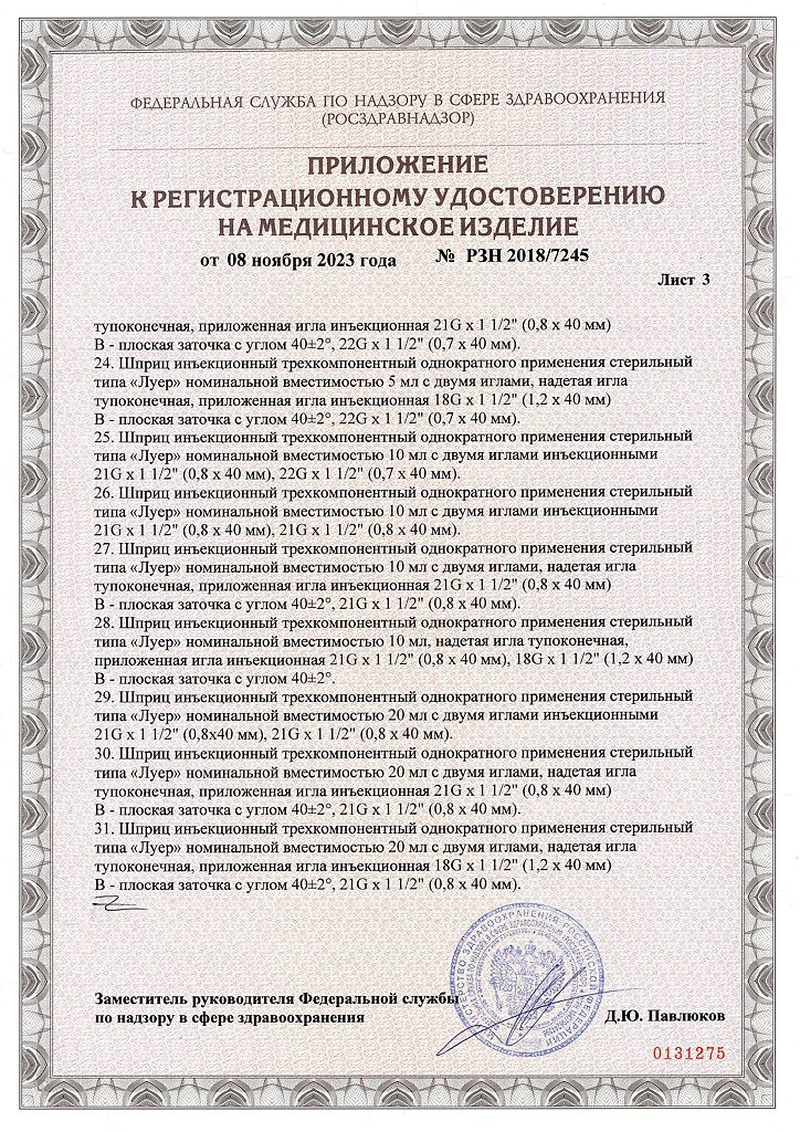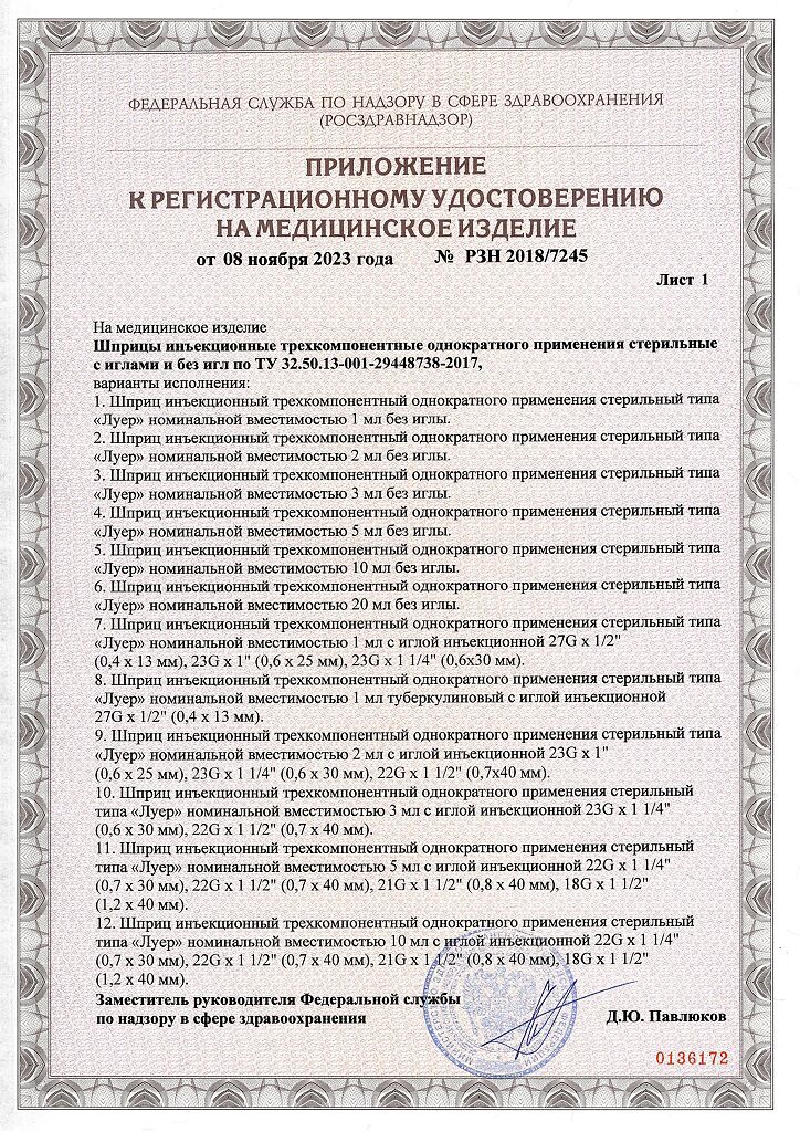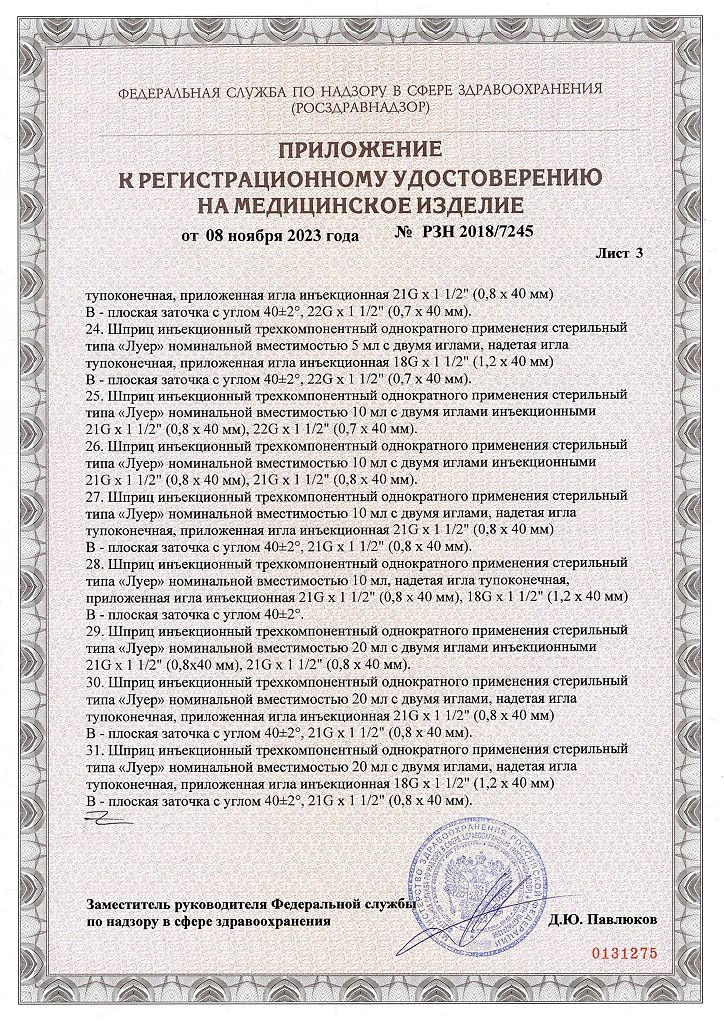 Шприц инъекционный 3-х компонентный однократного применения стерильный ТМ PASCAL'. Цилиндр полностью прозрачный для хорошей визуализации содержимого. Шкала хорошо читаемая. Расположена строго параллельно вертикальной оси цилиндра. Манжета не содержит латекс для предотвращения аллергических реакций. Игла инъекционная со стандартным срезом. Шприц упакован в индивидуальную блистерную упаковку с отогнутым краем, которая вскрывается с небольшим усилием, что предотвращает самопроизвольное вскрытие, и без образования бумажной бахромы.