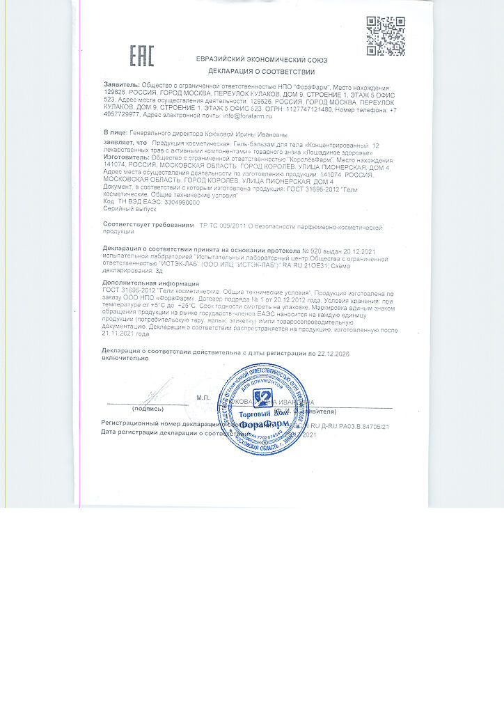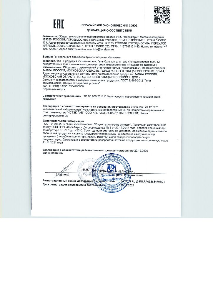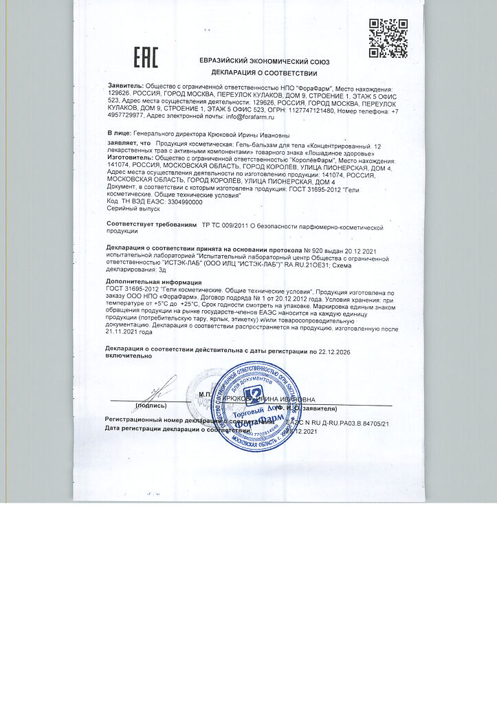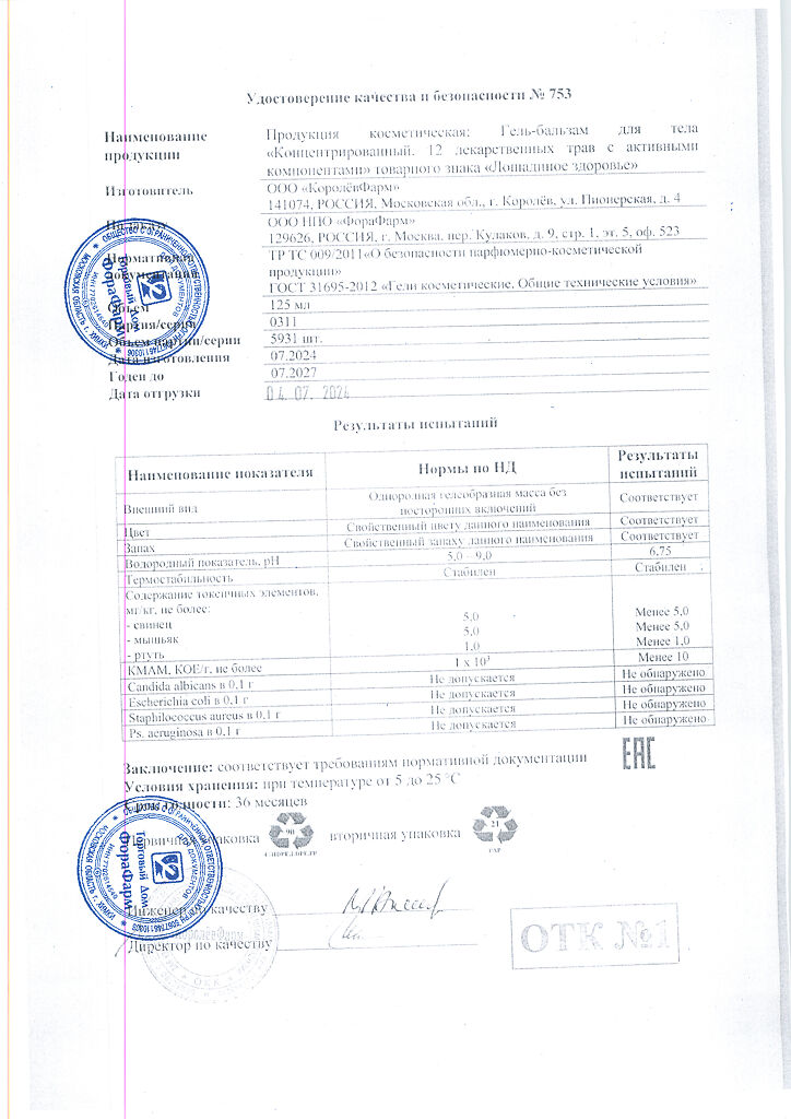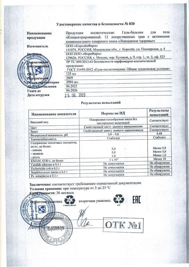 Документы Лошадиное здоровье гель-бальзам для тела концентрированный 12 лекарственных трав Королев Фарм 125 мл 1 шт