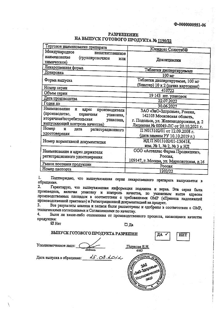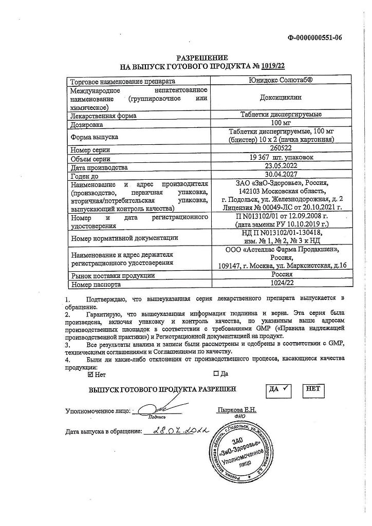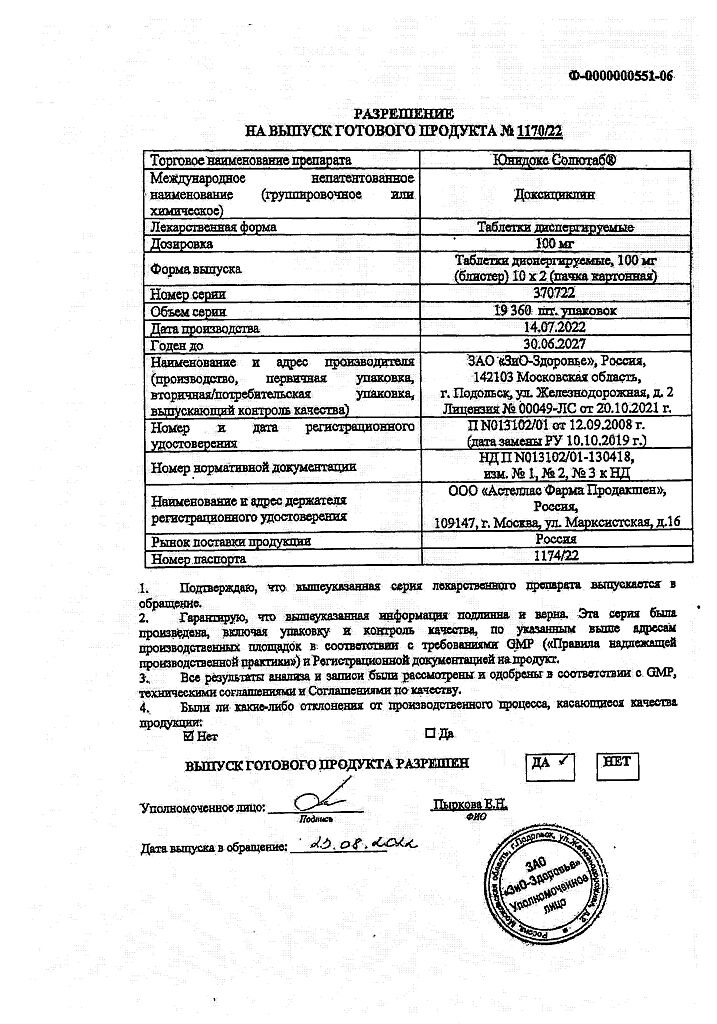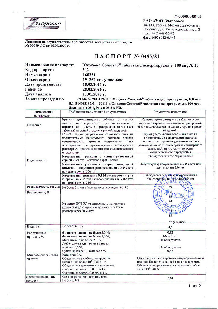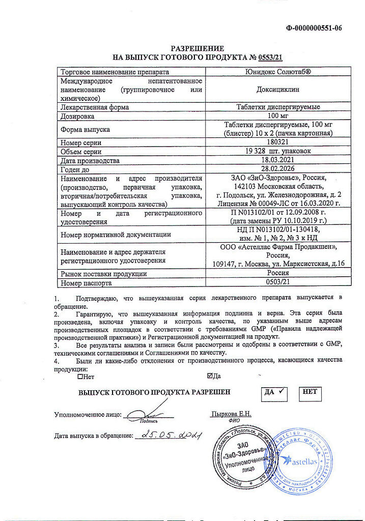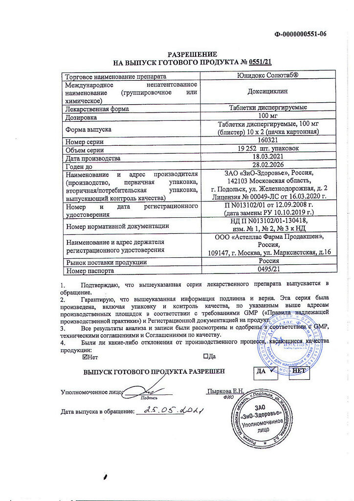 При инфекции, вызванной S.pyogenes, Юнидокс Солютаб ®принимают не менее 10 дней.