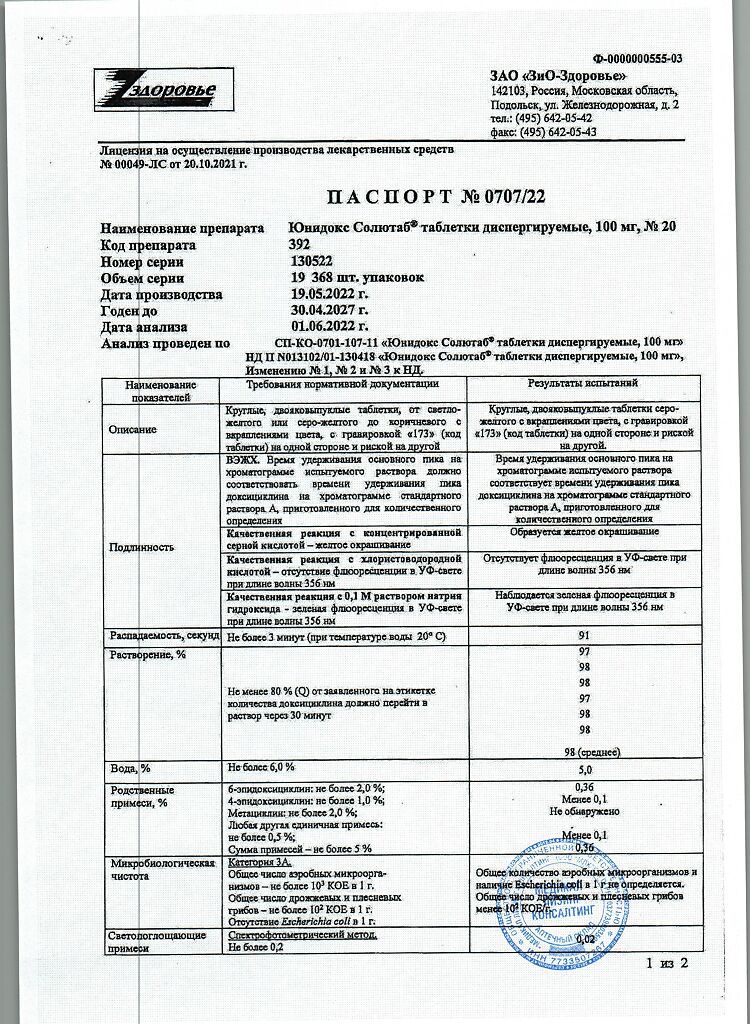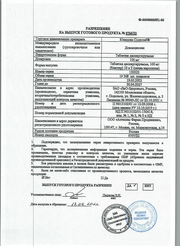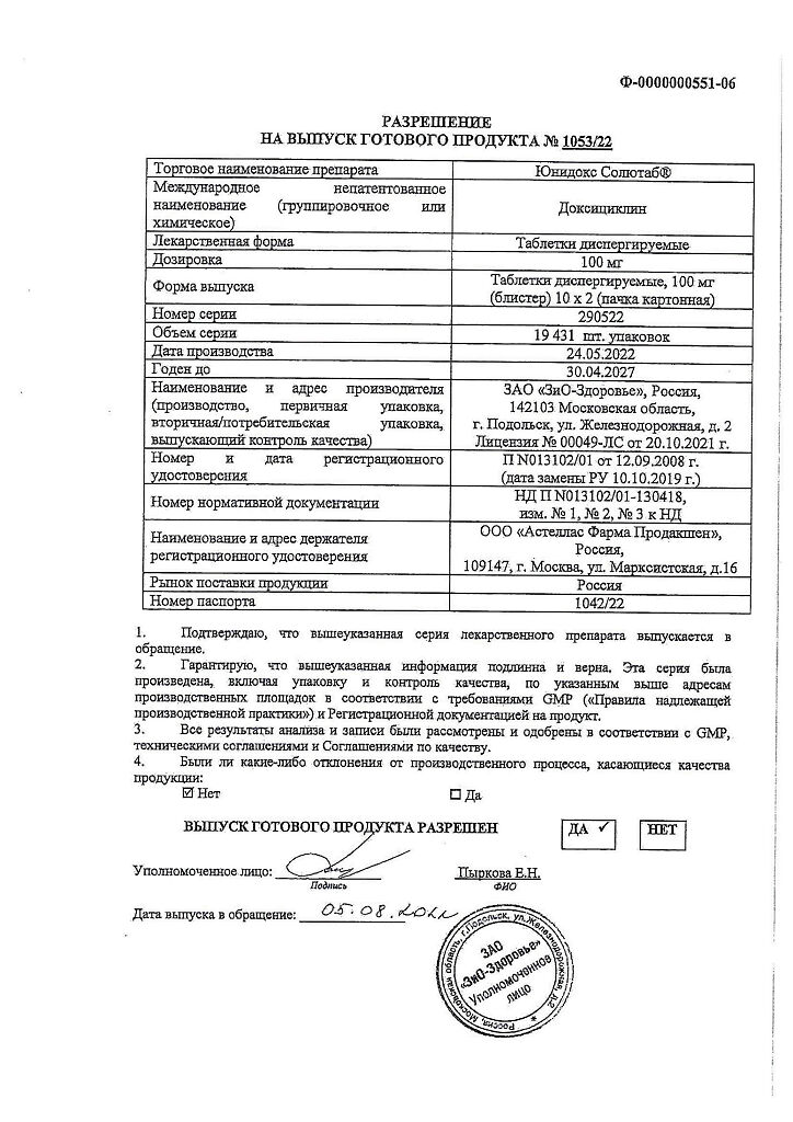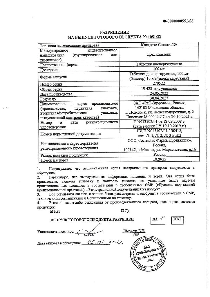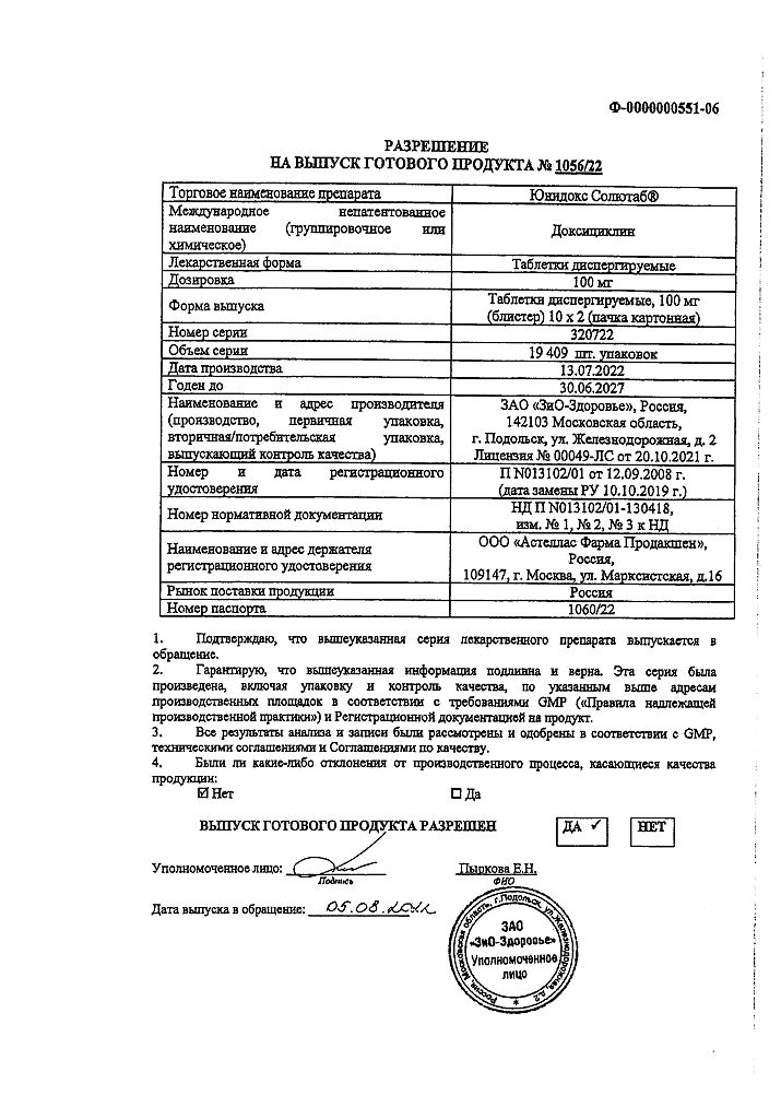 При инфекции, вызванной S.pyogenes, Юнидокс Солютаб ®принимают не менее 10 дней.