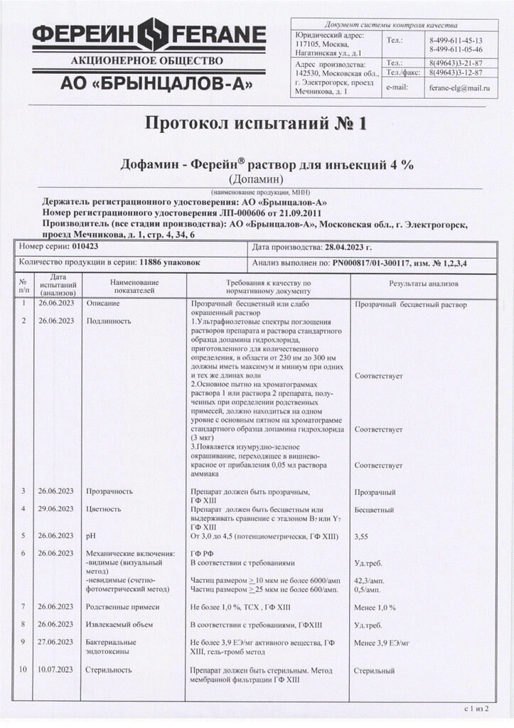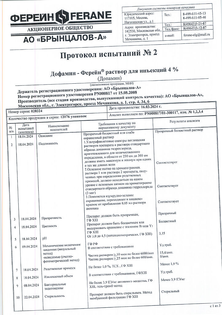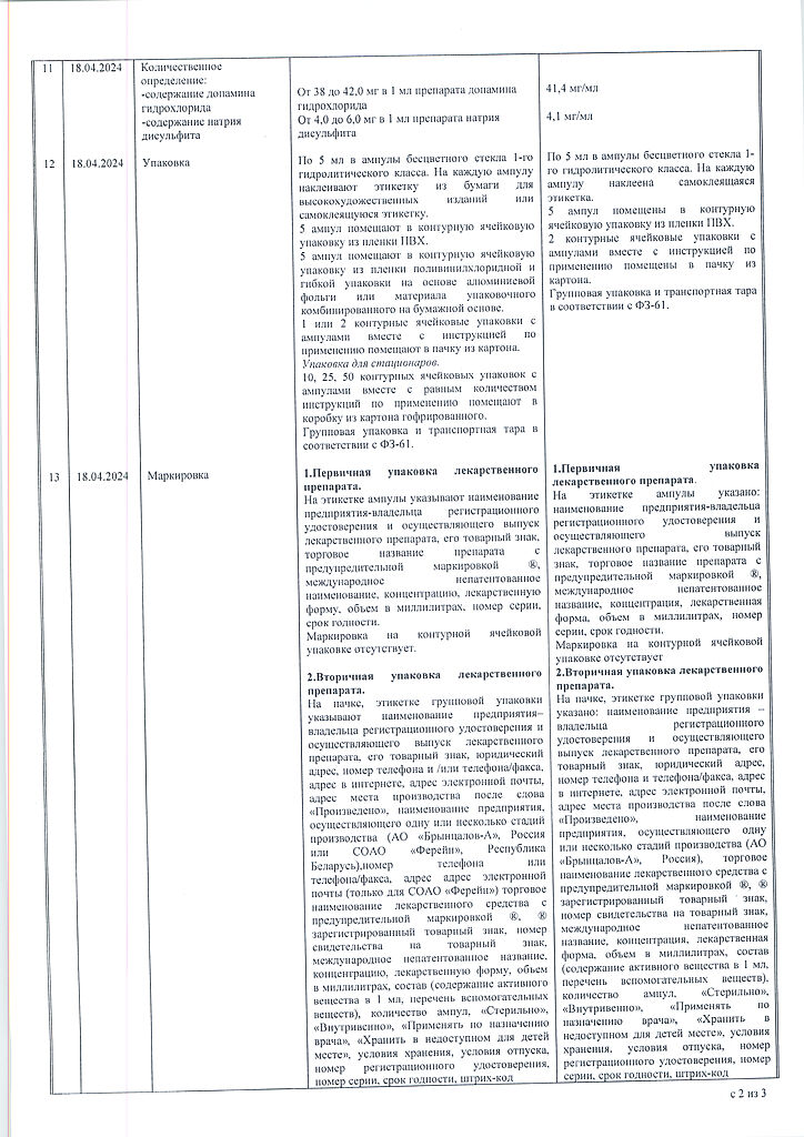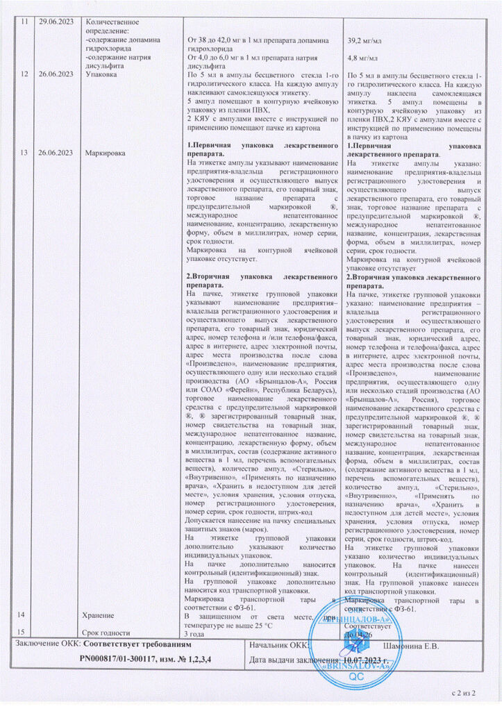 Правило приготовления раствора: для разведения используют 0,9 % раствор натрия хлорида, 5 % раствор декстрозы (включая их смеси), 5 % раствор декстрозы в растворе Рингера лактата, раствор натрия лактата и Рингера лактата. Для того, чтобы приготовить раствор для внутривенной инфузии 400-800 мг допамина необходимо добавить к 250 мл растворителя (концентрация допамина будет 1,6-3,2 мг/мл). Приготовление инфузионного раствора следует производить непосредственно перед использованием (стабильность раствора сохраняется 24 ч, за исключением смеси с раствором Рингер-лактата - максимум 6 ч). Раствор допамина должен быть прозрачным и бесцветным.