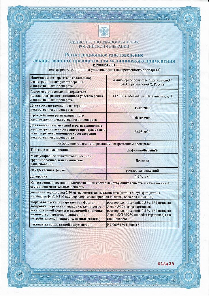Для усиления диуреза и получения инотропного эффекта (увеличение сократительной активности миокарда) вводят со скоростью 100-250 мкг/мин (1,5-3,5 мкг/кг/мин) - область низких доз. При интенсивной хирургической терапии - 300-700 мкг/мин (4-10 мкг/кг/мин) - область средних доз; при септическом шоке - 750-1500 мкг/мин (10,5-21 мкг/кг/мин) - область максимальных доз. С целью воздействия на АД рекомендуется повышение дозы до 500 мкг/мин и более, или при постоянной дозе допамина дополнительно назначается норэпинефрин (норадреналин) в дозе 5 мкг/мин при массе тела пациента около 70 кг.
