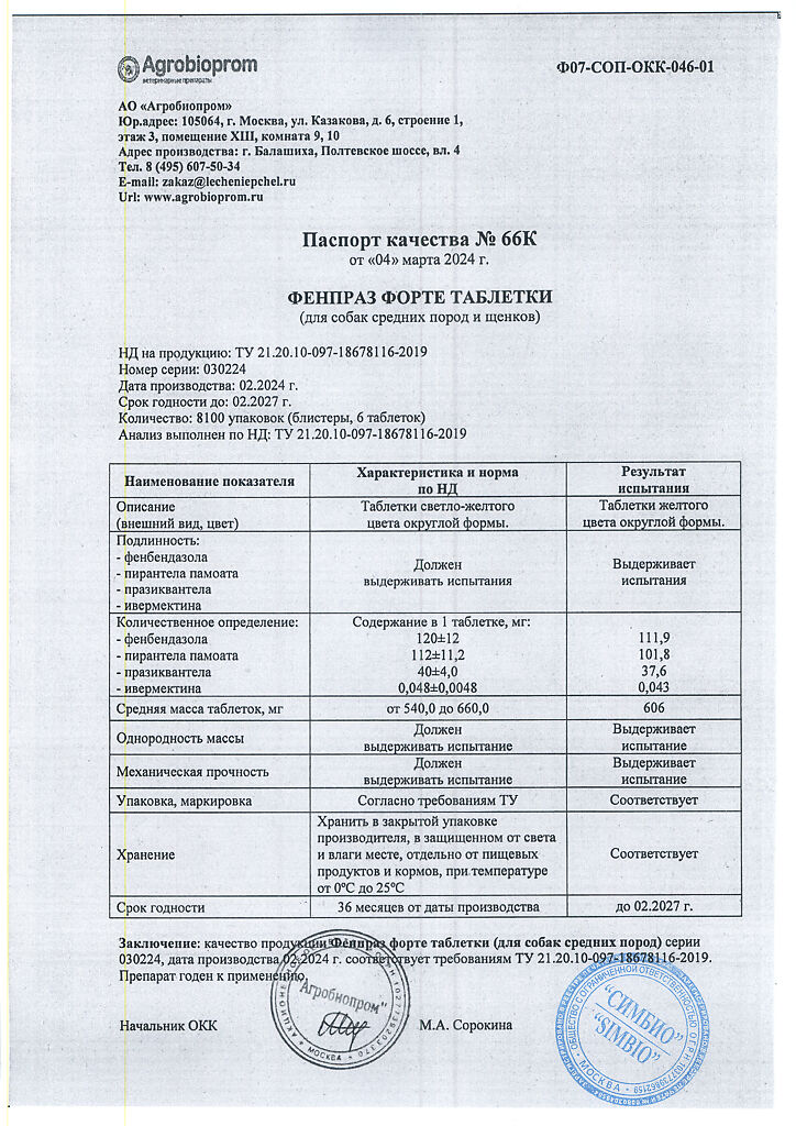 Фенпраз форте обладает широким спектром антигельминтного действия, уничтожает круглых и ленточных гельминтов, а также простейших рода лямблий (Giardia spp.). Маточное молочко, входящее в состав препарата, поддерживает функции печени, способствует уменьшению интоксикации и повышает иммунитет животного.