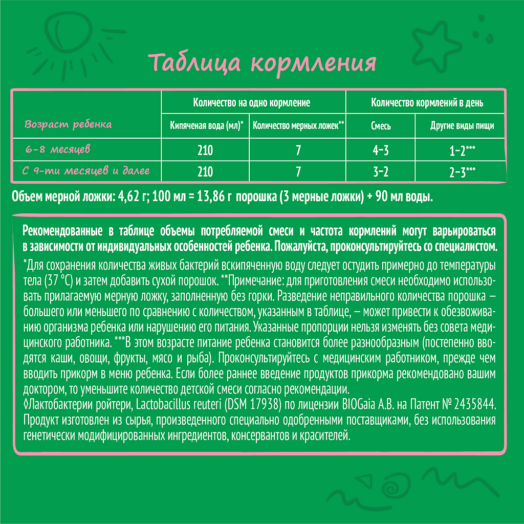 Всемирная организация здравоохранения рекомендует исключительно грудное вскармливание в первые 6 месяцев жизни и его продолжение в течение как можно более долгого периода. Компания Nestlé поддерживает данную рекомендацию. Для принятия решения о сроках и способе введения данного продукта в рацион ребенка необходима консультация специалиста. Товар зарегистрирован.
