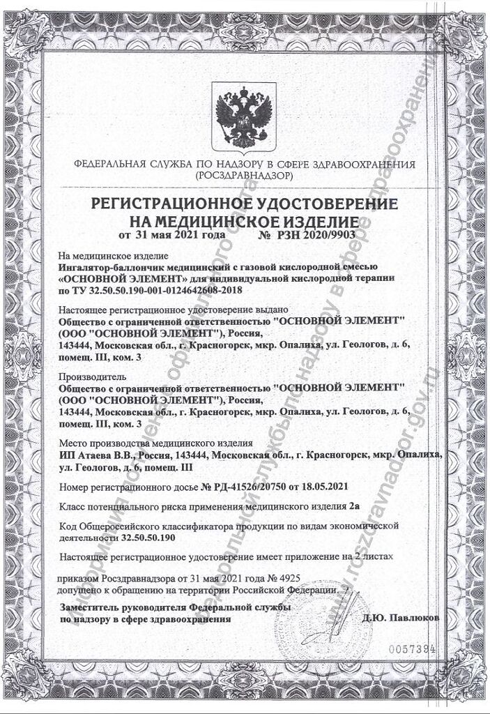 Документы Основной Элемент Ингалятор-баллончик с газовой кислородной смесью 17 л 5 шт + 1 с мягкой маской 1 уп