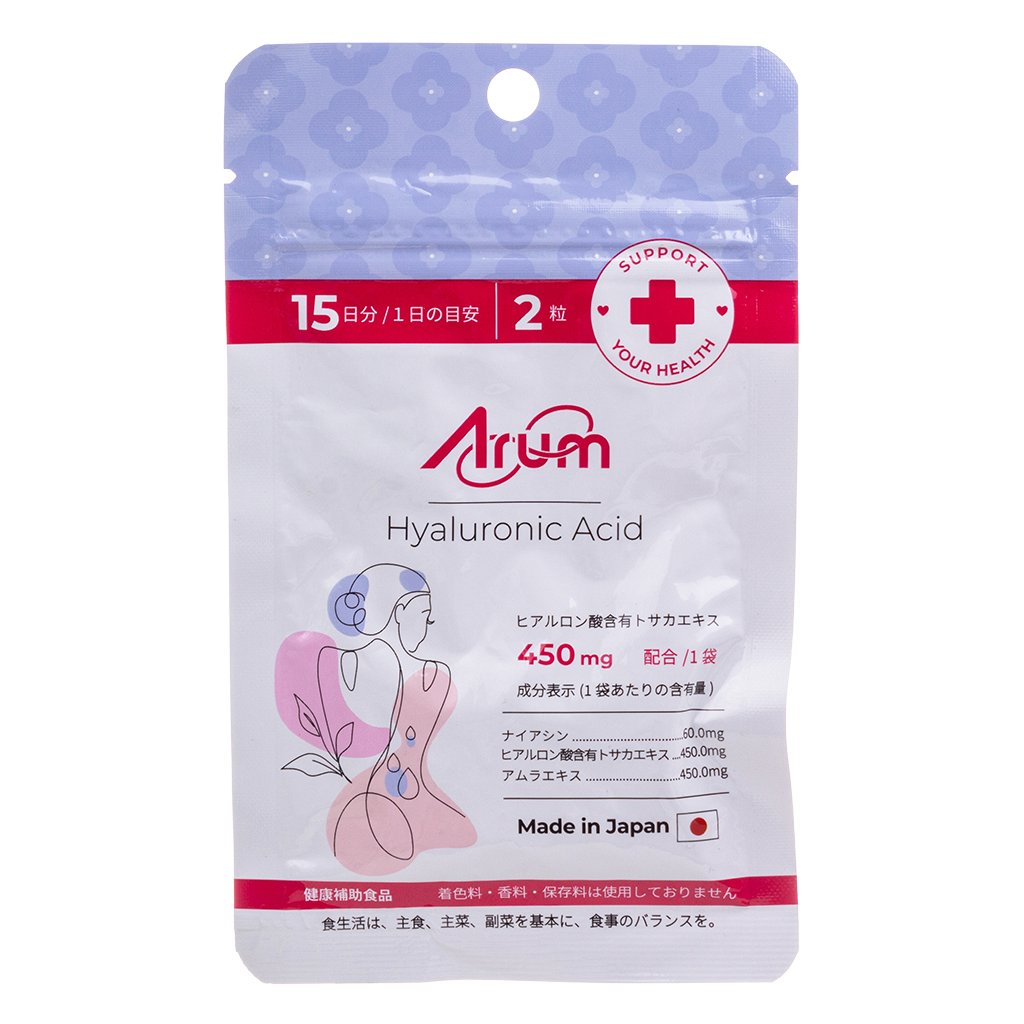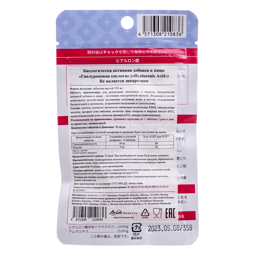 В двух таблетка: гиалуроновой кислоты -30 мг ; Ниацин - 4 мг.