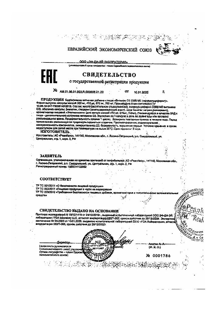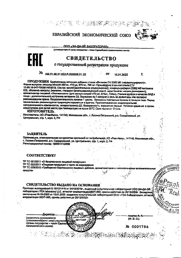 Масло растительное (подсолнечное), холекальциферол (2000 МЕ витамина D3), оболочкa капсулы: (желатин, глицерин (влагоудерживающий агент), вода, бензоат натрия (консервант), ароматизатор пищевой «Этилванилин»).